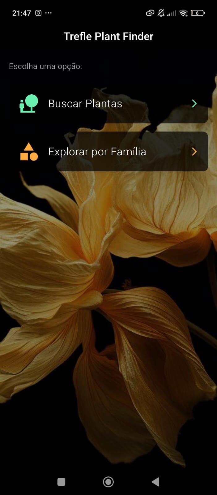 A busca é realizada consumindo a API do Trefle, que retorna dados botânicos como nome científico, imagens e família.