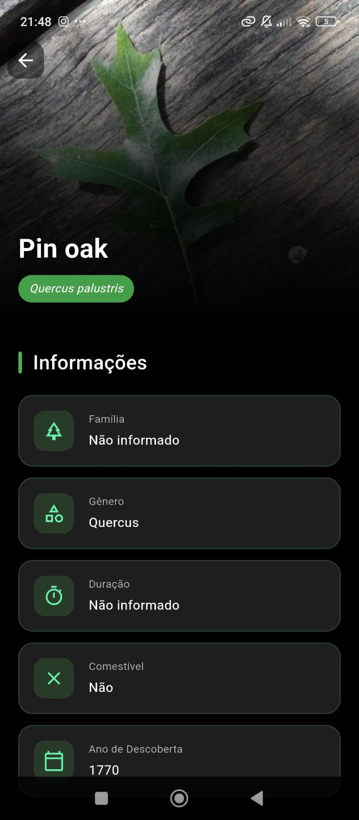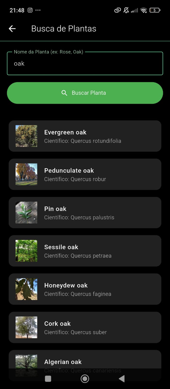 - Os resultados aparecem em cards com nome comum, nome científico e imagem.