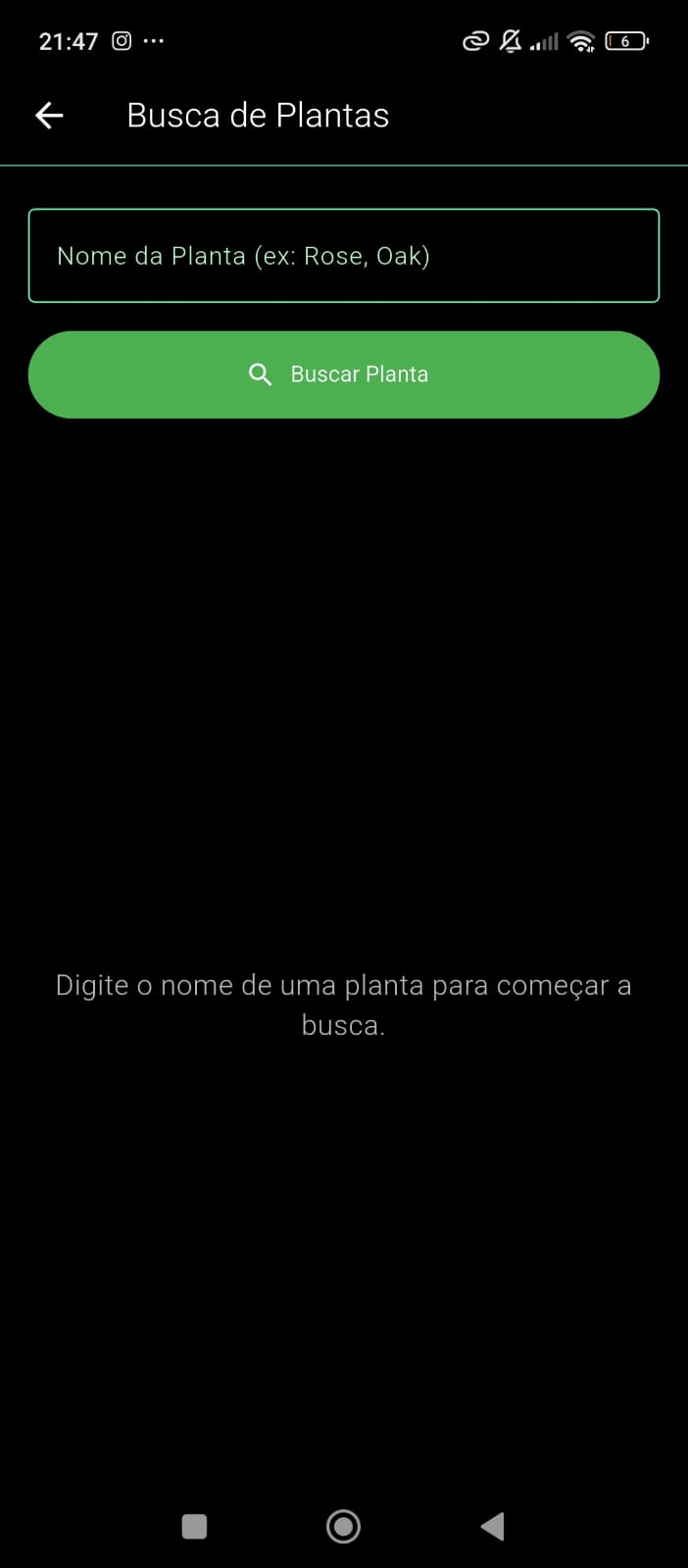 Interface simples para buscar informações sobre plantas a partir de um nome digitado pelo usuário.