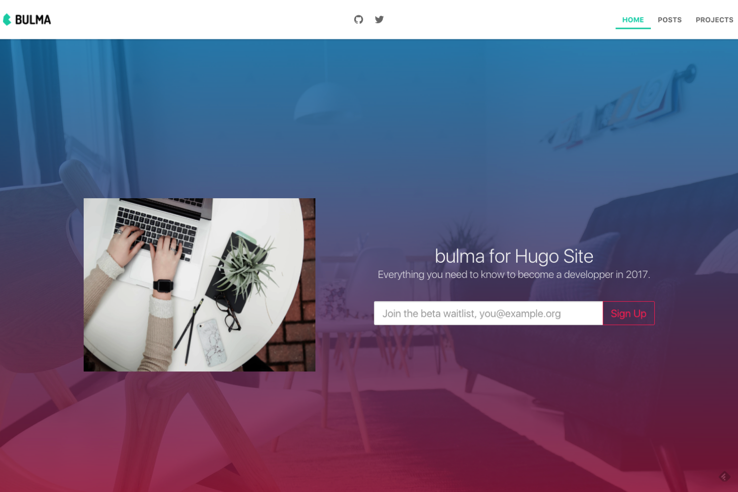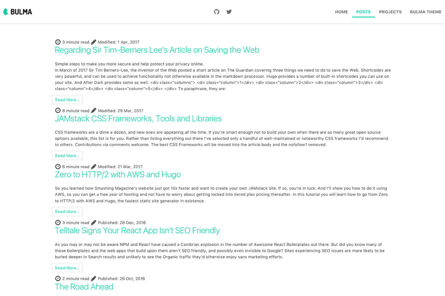 Bulma is a simple and a responsive Hugo theme that offers a traditional blog mixed with a landing page designed to bootstrap your frontend!.