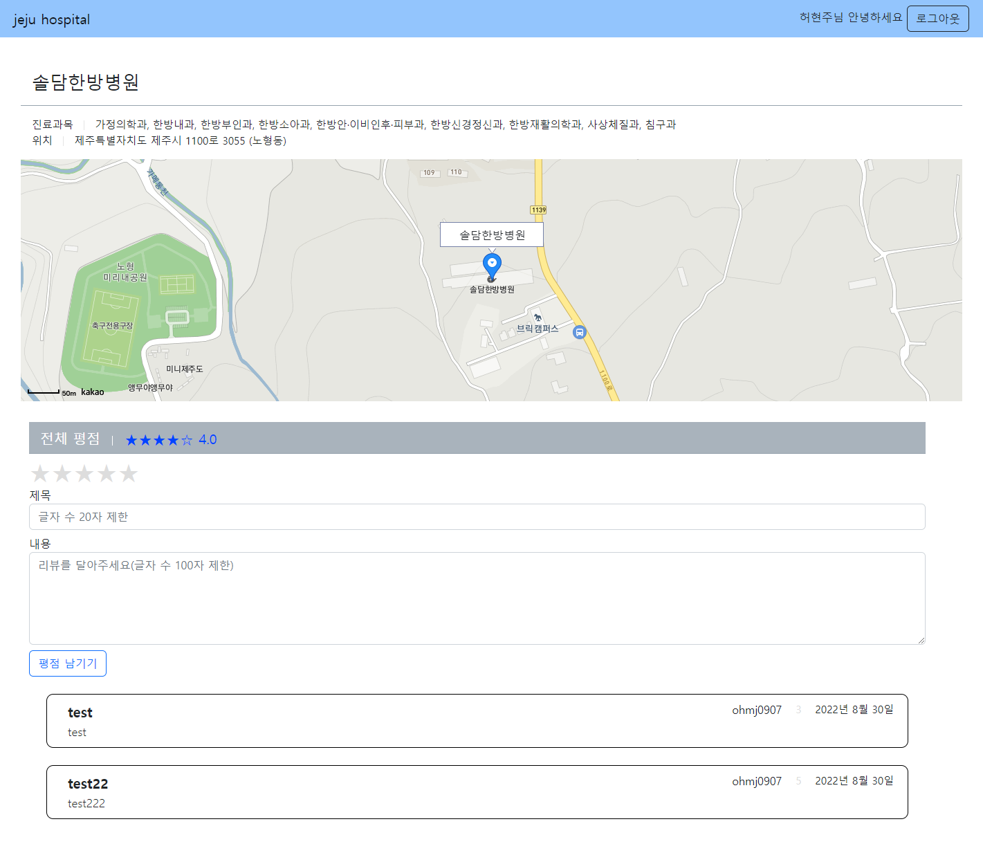 - 병원의 디테일 정보 : 병원 이름, 주소, kakao map api를 사용한 주소 마킹, 후기 모음