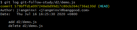 输入 git log /git-follow-study/d2/demo.js,只能看到一次文件的提交,即创建时的提交内容: