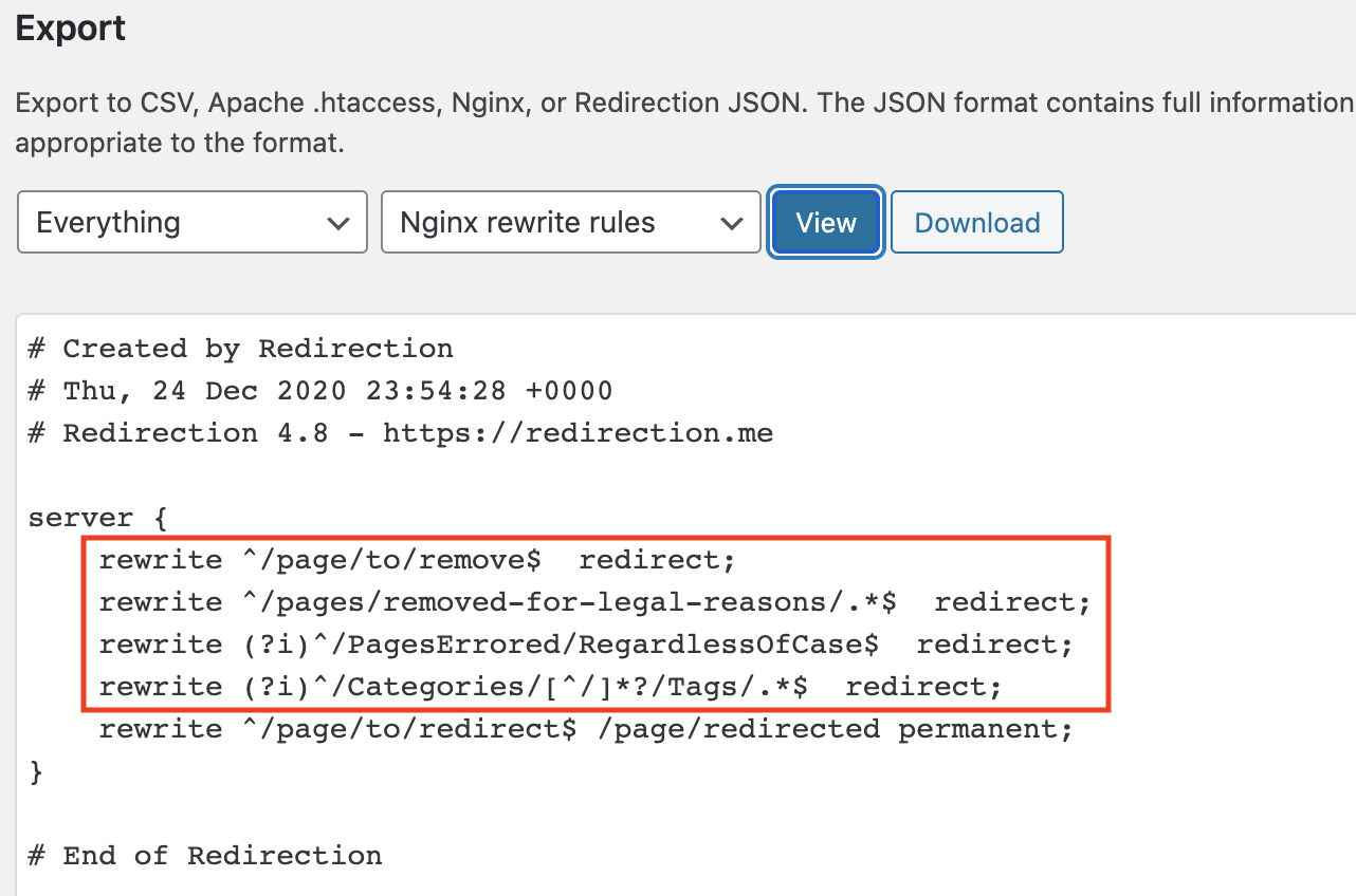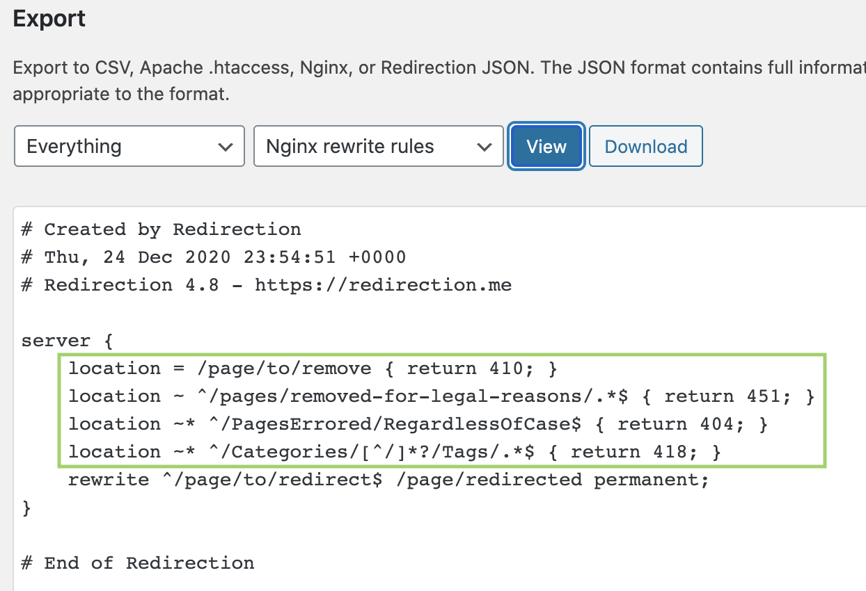 410to "kill" a url for SEO purposes or a451for legal takedowns) are not correctly exported in the nginx format, which this PR aims to fix.Example data