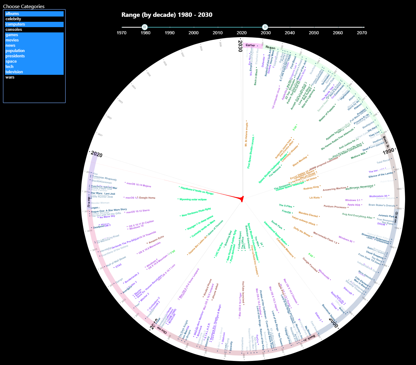 The lifeClock, is just a visualization configurable for any time range, and can contain any amount of categories. sizes can be adjusted per category (curently configurable only in the source data)