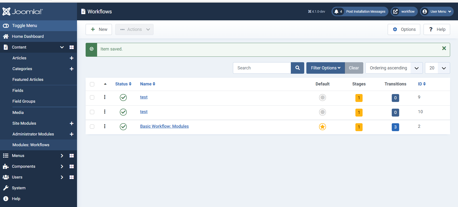 3. Test CRUD for workflows, stages and transitions in Modules: Workflows