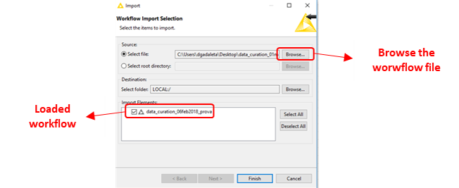 - Tick “Select File:” and go to “Browse…”. Select the *.knwf file of the workflow.