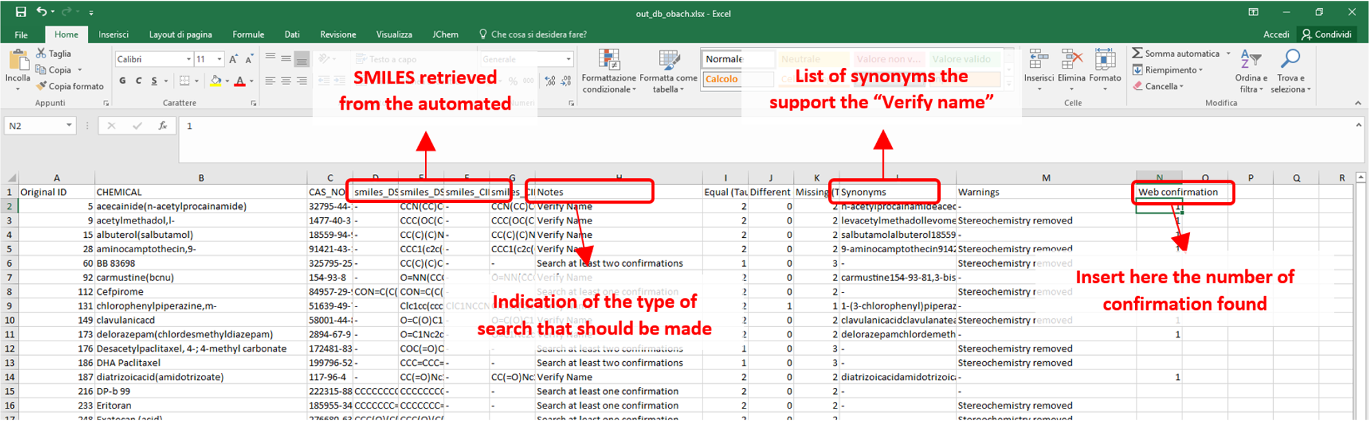 - Search at least one confirmation: the automatic procedure found coherent, but not complete information (i.e., two out of four SMILES are equal, the others are missing). The user should search a confirmation of the SMILES indicated in the excel file from both the chemical name and the CAS number for a source or a database on the web. If at least one confirmation is found, insert “1” in the corresponding “Web confirmation” cell. Otherwise, insert “0”.