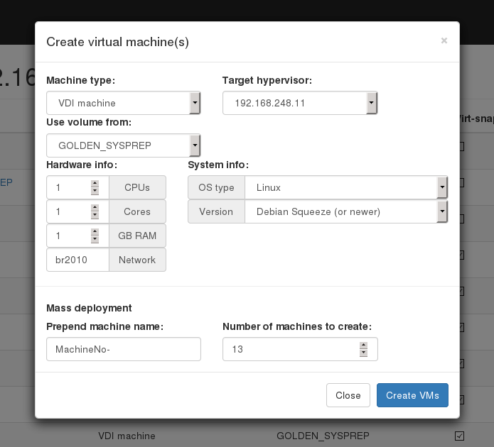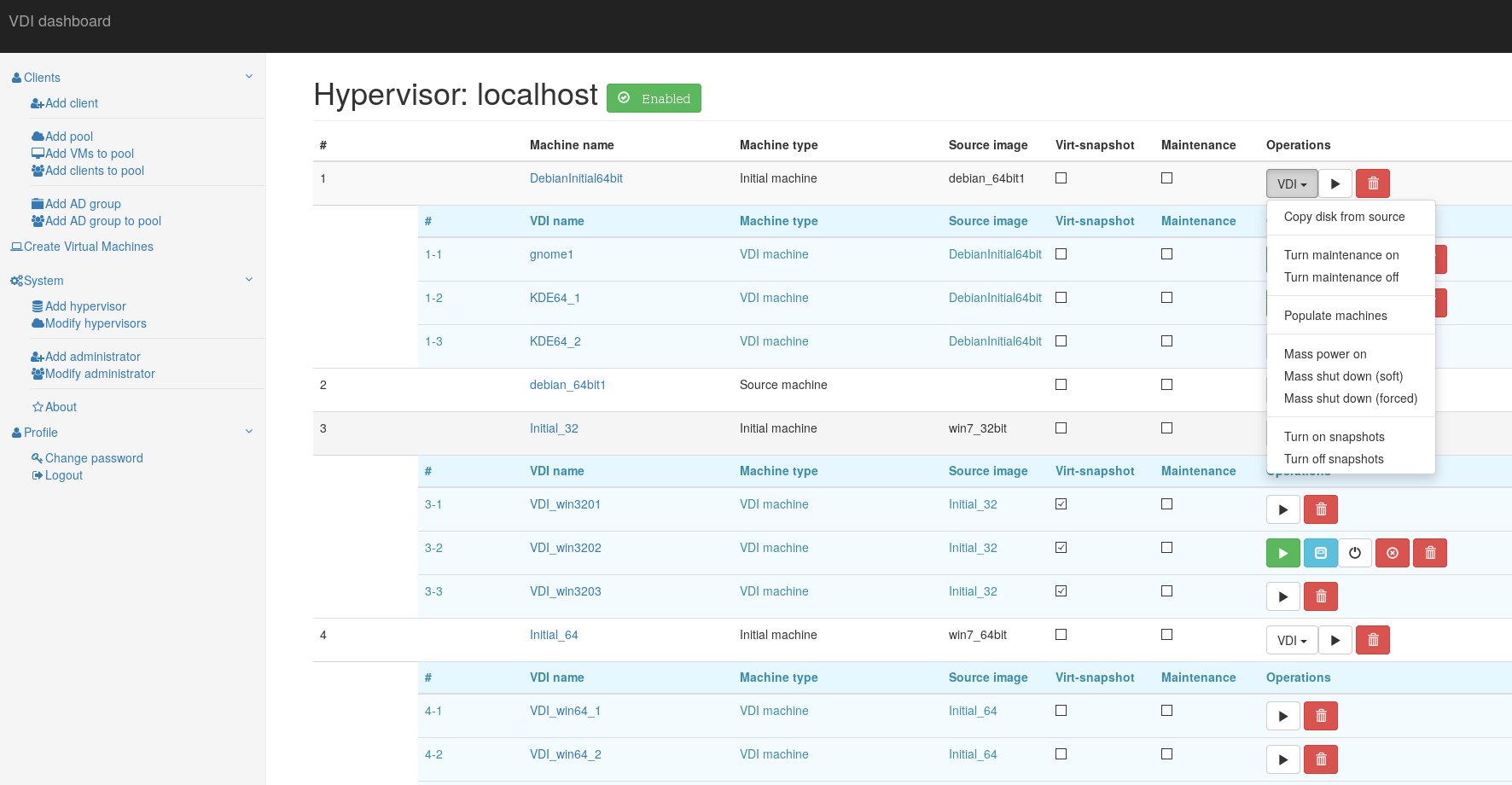 To provide a VDI enviroment you should take folowing steps: Create a "Source machine" and install a guest operating system to it. Create required number of VDI machines. Copy "Source machine's" disk image to "Initial machine's" disk image ("Copy disk from source" button). Create snapshots for all VDI VM's from "Initial machine's" disk image ("Populate machines" button); Configure "clients.xml" file, to provide thin clients with it's own VDI VM.