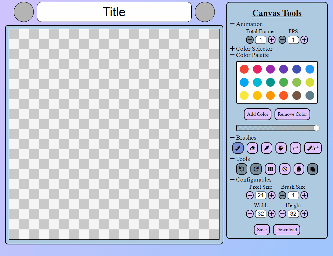 One challenge that was fun to address was optimizing the HTML canvas element for use in pixel art. This required various unique solutions such as using a custom hook to better integrate the element into React as well as handling what the definition of a pixel was. In order to make this element truly dynamic, a rendering method was created for it that would scale based off of the pixel width selected by the user. In this way, a pixel on the canvas would really be something like 20 pixels on the screen. This logic was central to later integration of all the other canvas tools.
