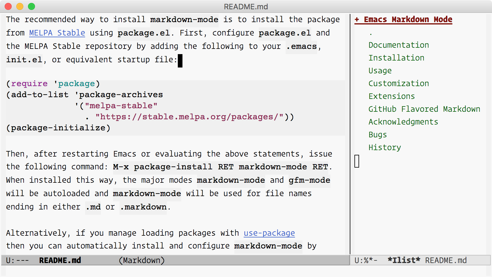 - Debian Linux: elpa-markdown-mode and emacs-goodies-el