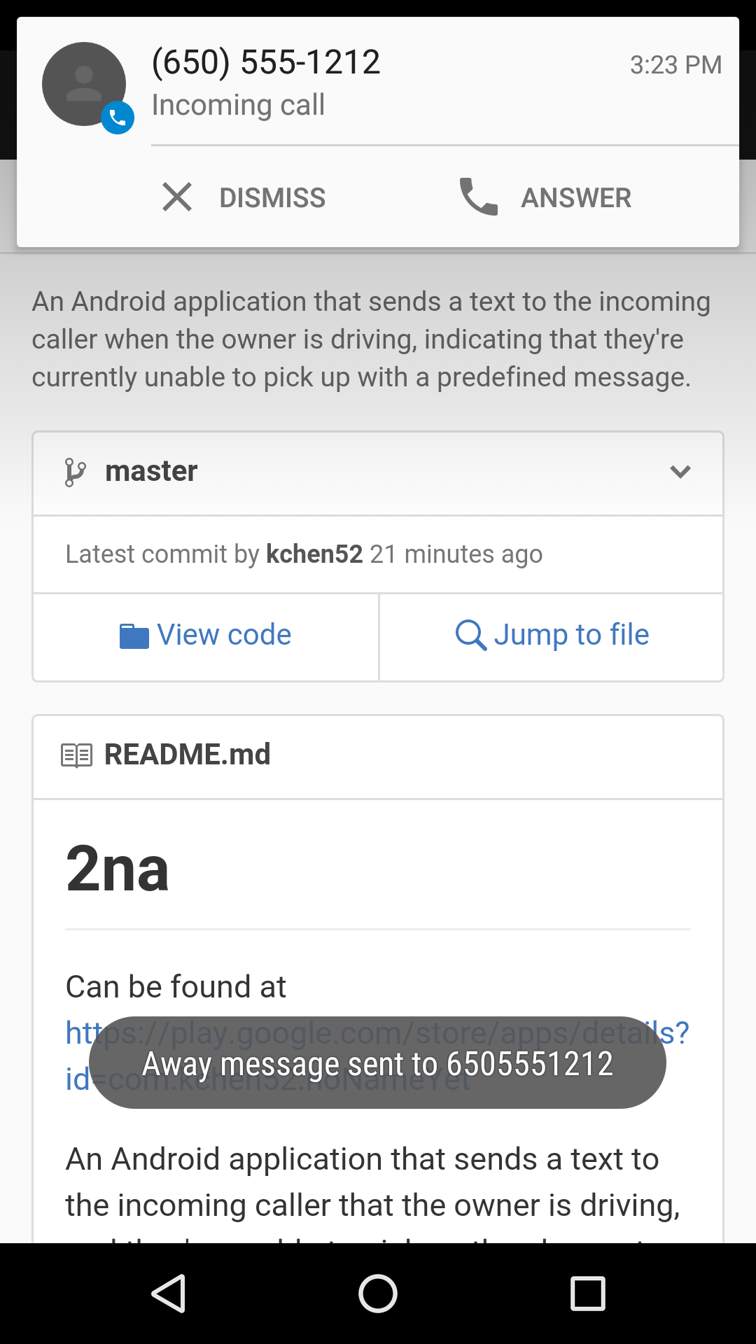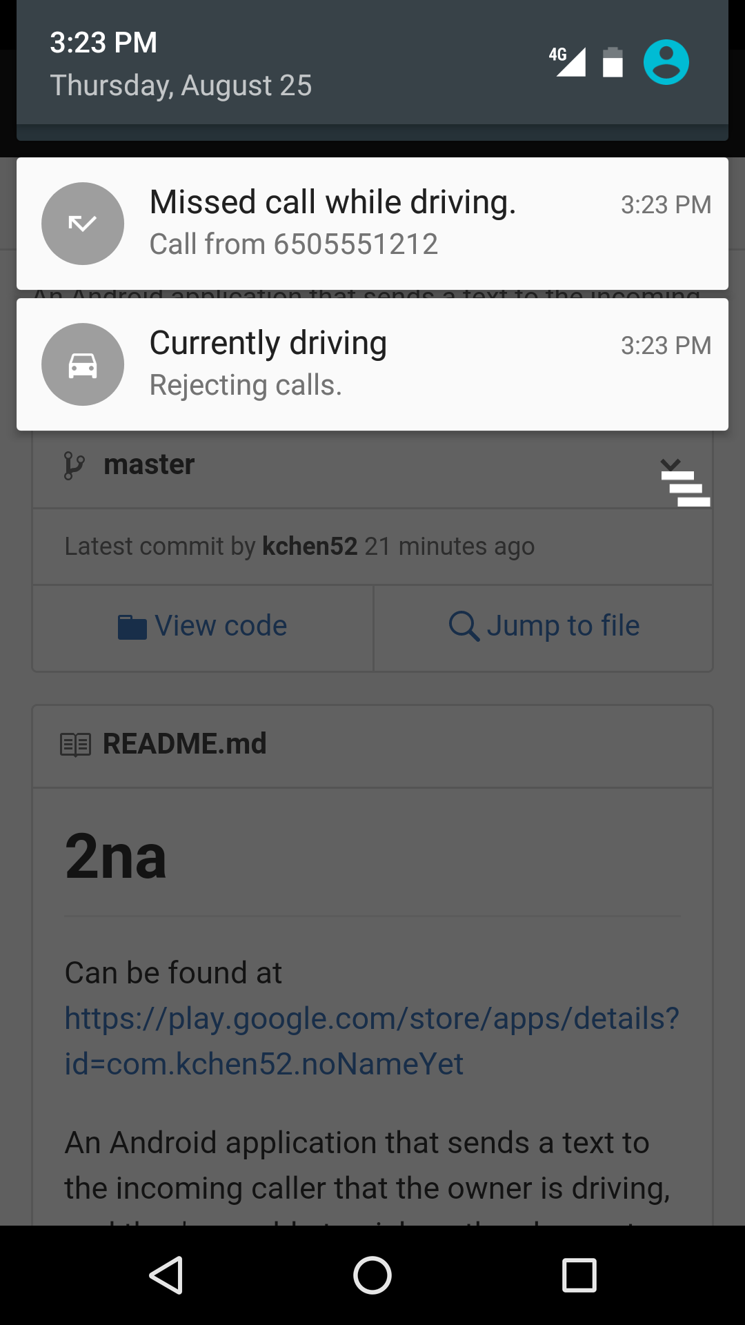 2na is an Android application that allows a user to block all incoming phone calls while driving. By default, any incoming calls will be automatically dropped when in "Driving" mode, although this can be changed in the settings. Any missed calls are displayed as a notification to the user.