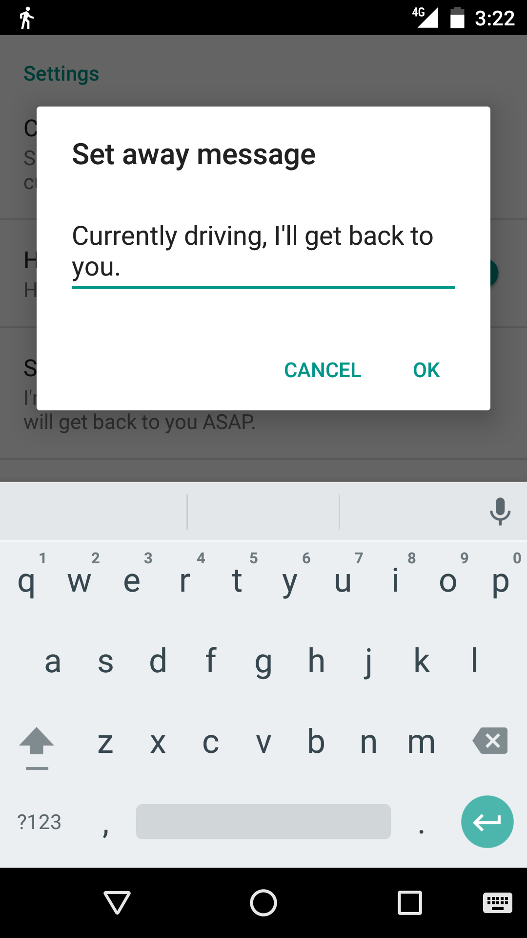 The message is set by launching the Settings activity, and set from there. Toggle between Driving and Non-Driving modes by clicking on the corresponding action in the notification bar, or changing the value in the Settings Activity.