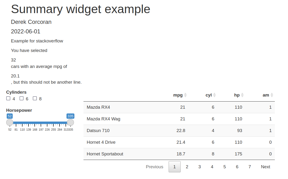 I have been using the crosstalk package, and I am a big fan, however, I have the issue that I can`t seem to understand how to put the output of the package in an inline code. The webpage states the following: