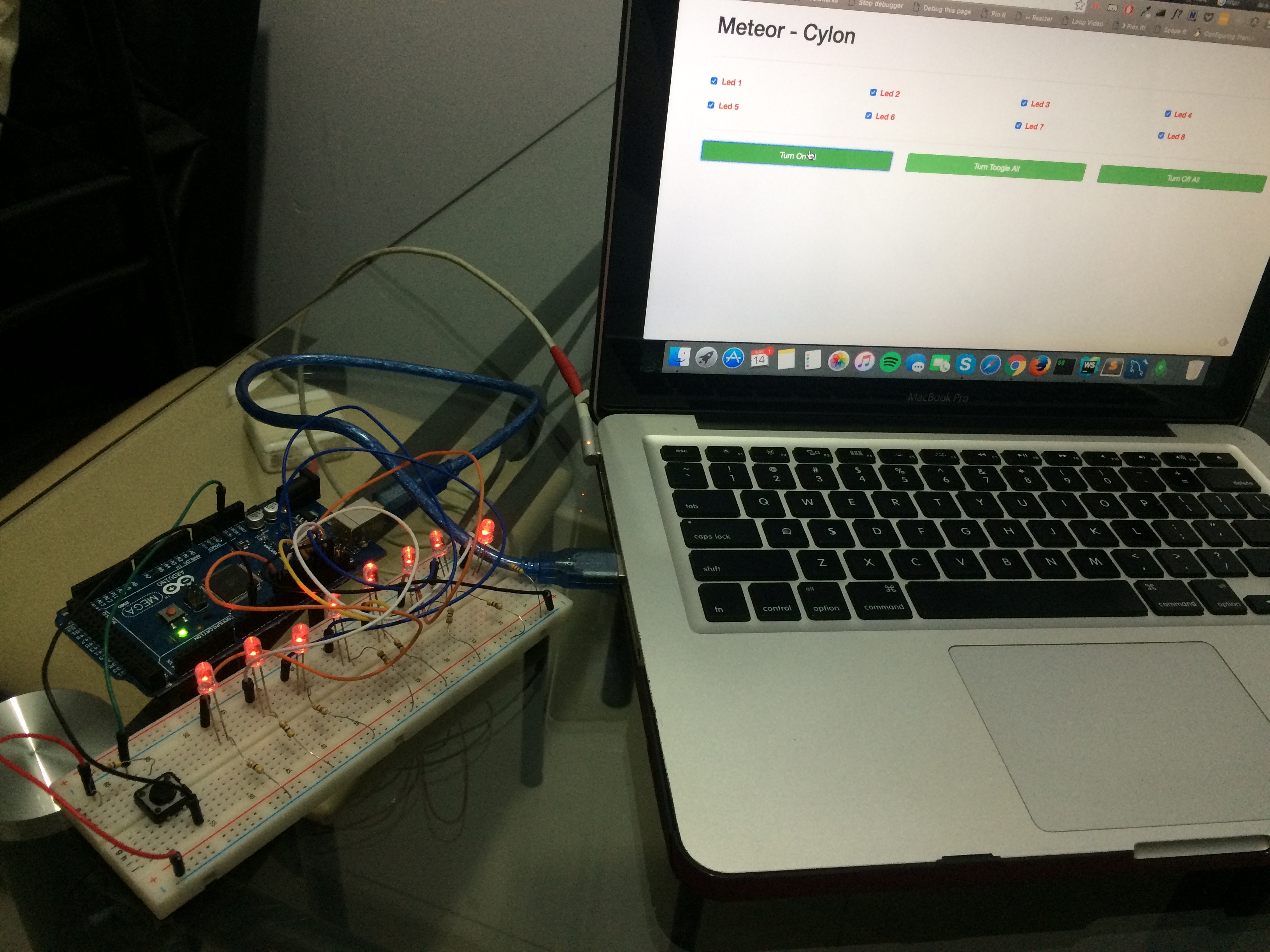 Meteor app, using Arduino Mega2560 and CylonJs (Framework for Robotics), allow control LEDs and Buttons from Web & Mobile.