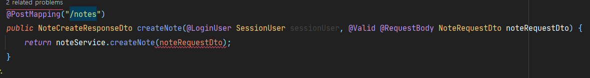 위와 같이 NoteController의 createNote 메서드에서 @loginuser라는 어노테이션을 이용해 세션에서 SessionUser를 받아와 사용하려합니다. Note가 생성될 때 User객체도 Note에 포함되야하기 때문에 SessionUser를 User로 변환하는 작업(이지만 사실은 UserRepository에서 User를 꺼내오는 작업)이 필요할 것 같습니다.