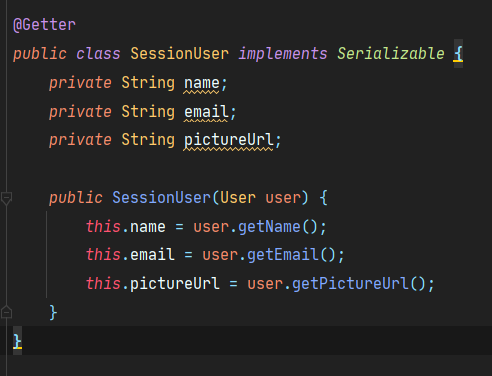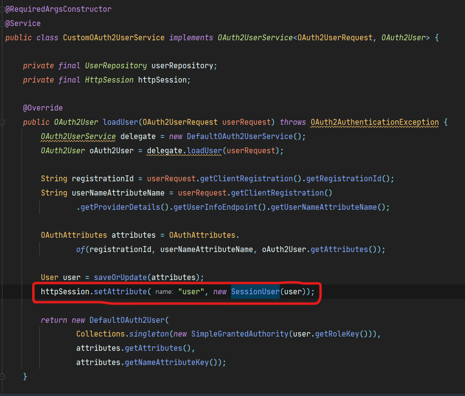 SessionUser는 Serializable을 구현한 dto이고, CustomOAuth2UserService에서 session에 다음과 같이 저장되고 있습니다.