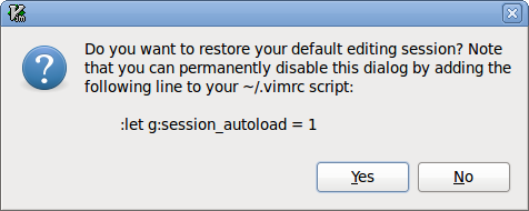 If you want, the plug-in can also automatically save your session every few minutes (see the g:session_autosave_periodic option). When you start Vim without editing any files and the default session exists, you'll be prompted whether you want to restore the default session:
