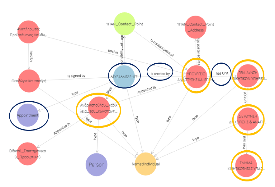 - the Organization which creates/issues the decision and appoints the Person, right next to the decision id in red: the ’HELLENIC MINISTRY OF DEVELOPMENT AND INVESTMENTS’( ΥΠΟΥΡΓΕΙΟ ΑΝΑΠΤΥΞΗΣ ΚΑΙ ΕΠΕΝ. in Greek). The object property labeled ’is created by’ is used to identify the issuing Organization;