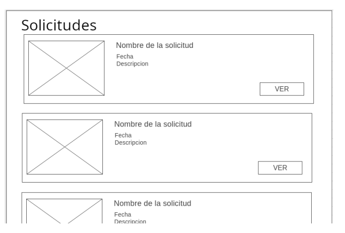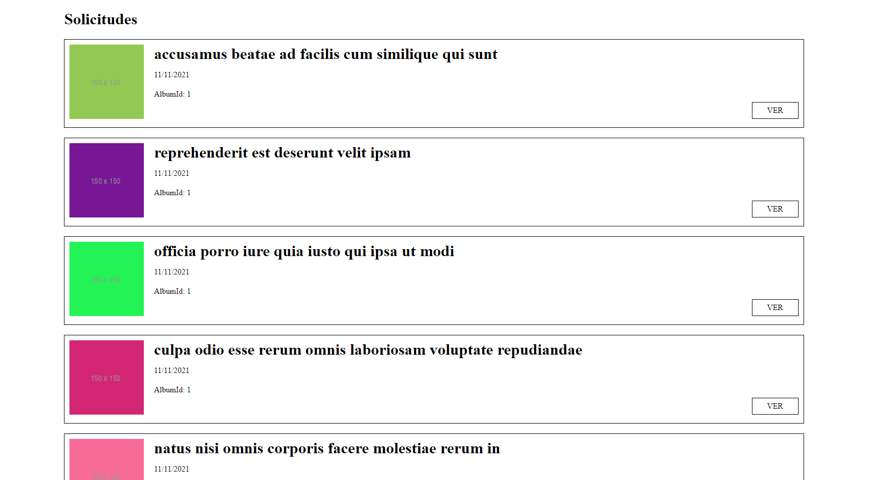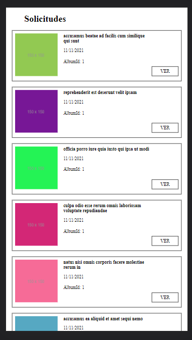 En la pantalla se deber ́a mostrar la foto, que proviene del campo thumbnailUrl; el t ́ıtulo, que proviene del campo title; en donde dice ”Fecha”se deber ́a mostrar la fecha de hoy, y en donde dice Descripci ́on deber ́a decir ”AlbumId: {albumId}”. Al hacer clic en ”Ver”, se debe redirigir a /solicitudes/{id}, donde id es el campo que proviene de cada registro devuelto por la API.