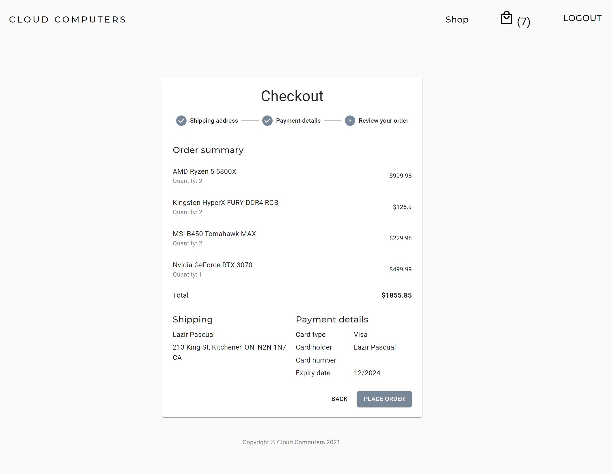 - After a user clicks the checkout button, they are prompted to fill in their personal information which includes shipping address and credit card info (does not actually need to be filled in, only used for demonstration). A final summary of their purchase is displayed here, and by clicking the place order button, an order confirmation message is sent to the user.