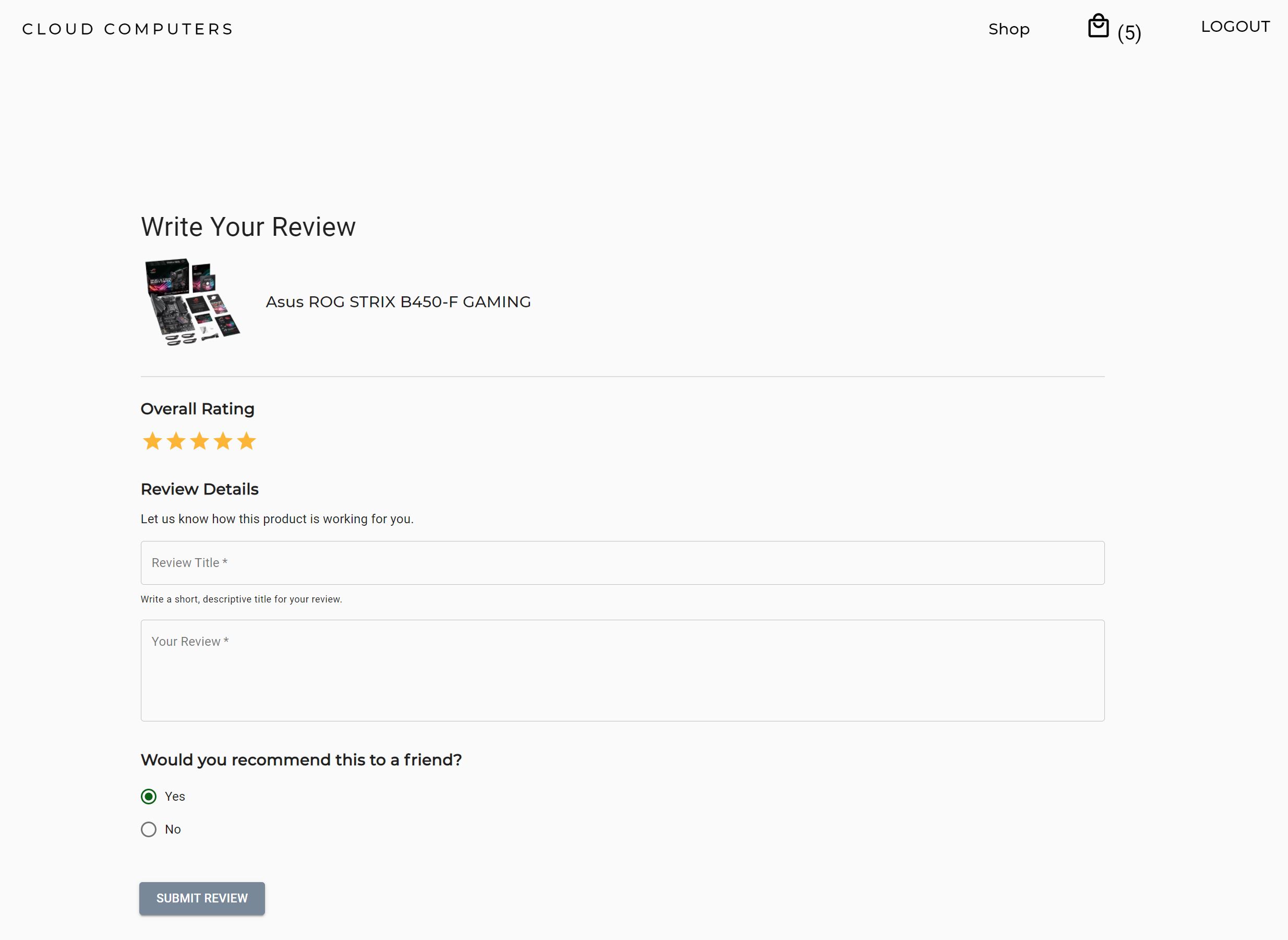 - When a user clicks on the "write a review" button on the product page, they are then prompted a review form from this page. Users can choose a rating from 1-5 and write their reviews which contains a title, a description, as well as an option to choose whether they would recommend this product to a friend or not.