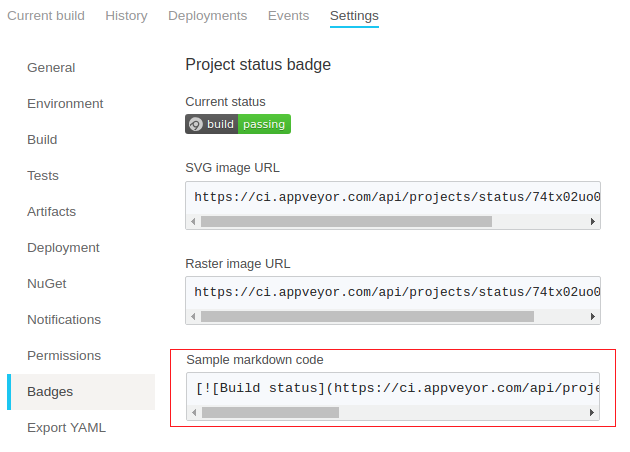 AppVeyor предлагает код для бейджика статуса вашего проекта: