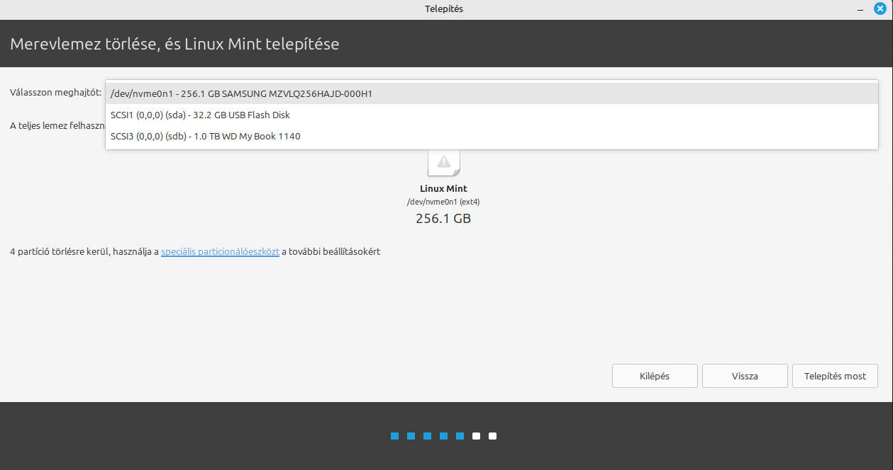 The installer notices that Windows on the laptop is installed on the internal (nvme) drive, but there is also an external (USB) drive connected. The partition partitioner/drive selector that appears in the next window is confusing...
