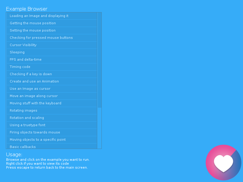 Löve-Example-Browser Example browser containing many helpful examples to get you started in Löve. Check out the online demo. Ported to LÖVE 0.11.1 by slowb33. Examples for previous LÖVE versions can be found here.