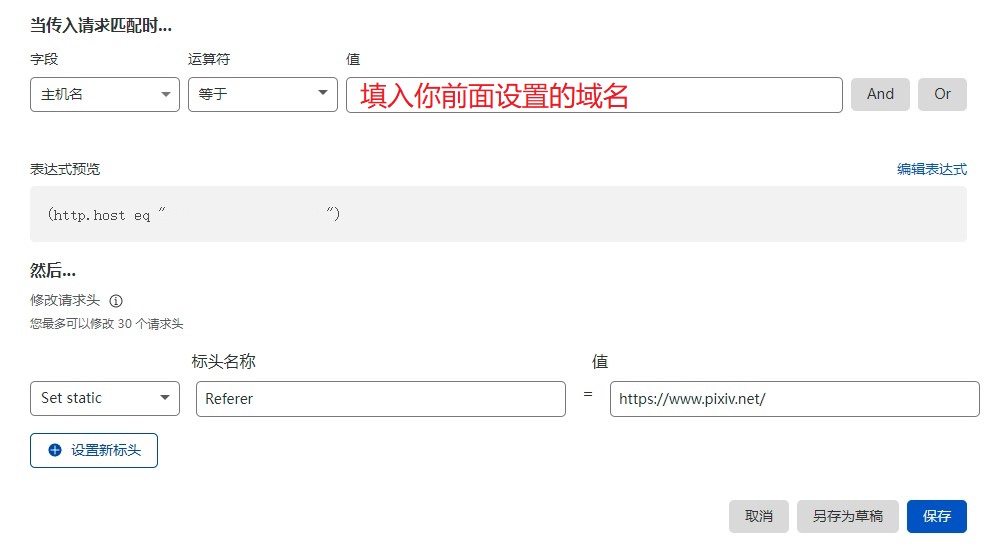 CNAME,名称根据你的需要填入,内容填入i.pximg.net,并开启代理。然后在规则->转换规则处,创建修改请求头规则,如下图设置 - 若无顶级域名,则使用Cloudflare Workers搭建反向代理,每日100,000次请求,参考代码来自pixiv.cat