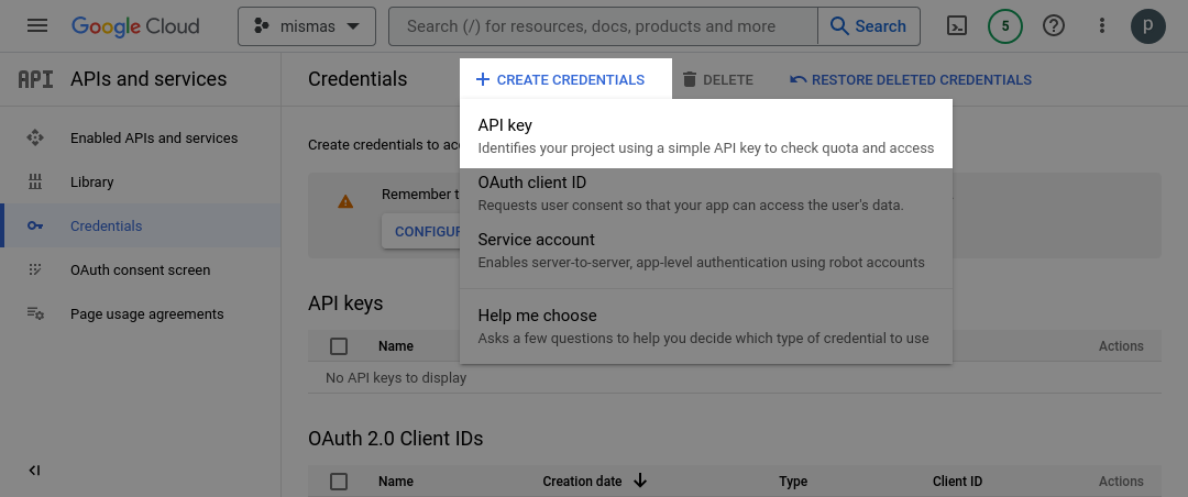 The next step is to create two credentials: an API Key and a Service Account. Selecting "Create Credentials > API Key" will generate an API Key for the project and display it in a pop-up window. The key can then be copied and pasted into a text file named "API Key.txt" which should be saved in the mismas/credentials directory.