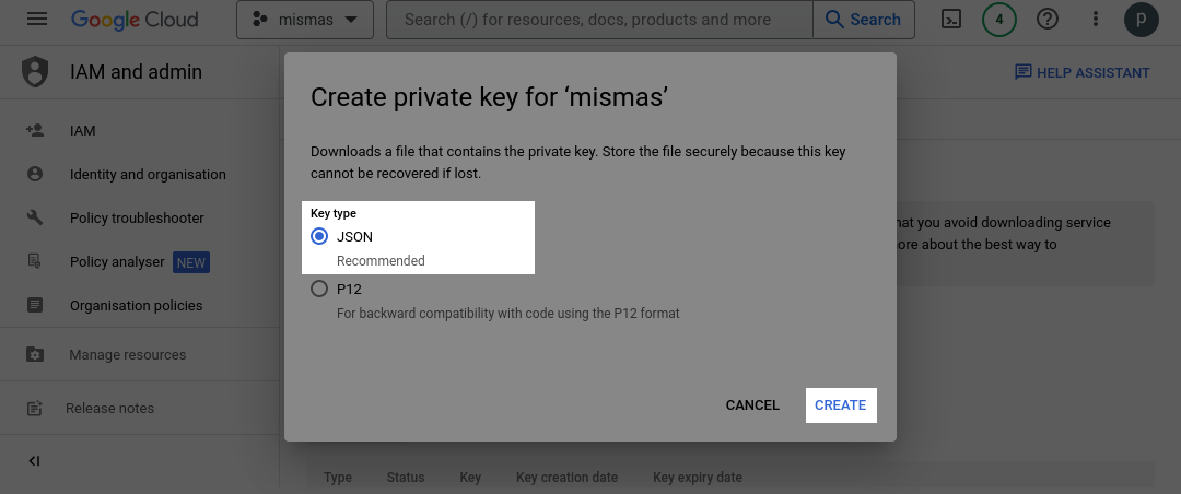 A pop-up window will appear with the option to create the key in JSON format, which will be selected by default. Clicking on "Create" will generate and download the key, which should then be moved to the mismas/credentials directory.