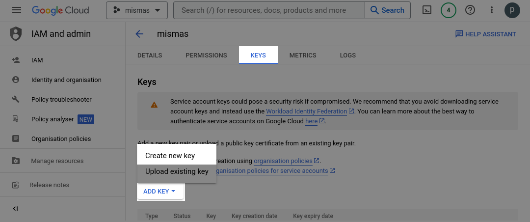 After clicking on the email address associated with the Service Account, the user will be directed to a page displaying the Service Account details. From this page, navigate to the "Keys" tab and click on "Add Key > Create new key".