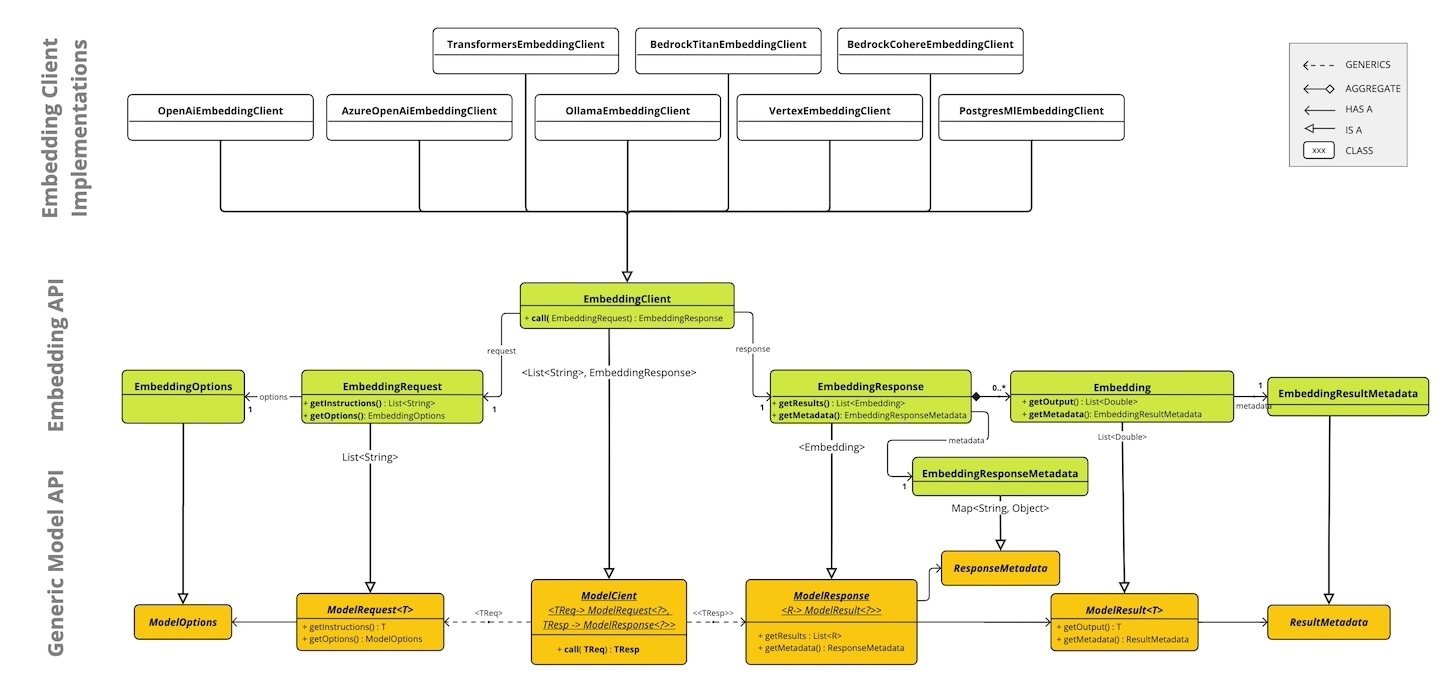 Portability: The design of this interface is like a universal adapter in the world of embedding models. It's crafted to fit seamlessly with various embedding techniques. This means, as a developer, you can easily switch from one embedding model to another without having to overhaul your code. This flexibility is in sync with the principles of modularity and interchangeability, much like how Spring framework operates. Simplicity: With methods like embed(String text) and embed(Document document), EmbeddingClient takes the heavy lifting off your shoulders. It converts text to embeddings without requiring you to get tangled in the complexities of text processing and embedding algorithms. This is particularly beneficial for those who are new to the AI field, allowing them to leverage the power of embeddings in their applications without needing a deep dive into the technicalities. In essence, as a software engineer, when you use EmbeddingClient, you're leveraging a tool that not only simplifies the integration of advanced AI capabilities into your applications but also ensures that your code remains agile and adaptable to various embedding models.