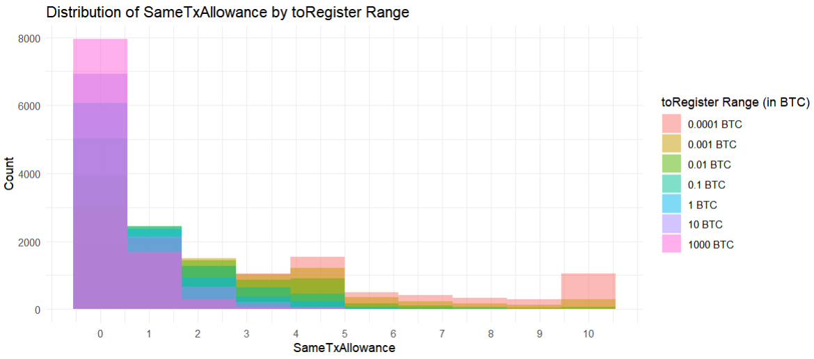 For each Bitcoin amount, the GetRandomBiasedSameTxAllowance function is called 10,000 times (by default) to simulate STA values.