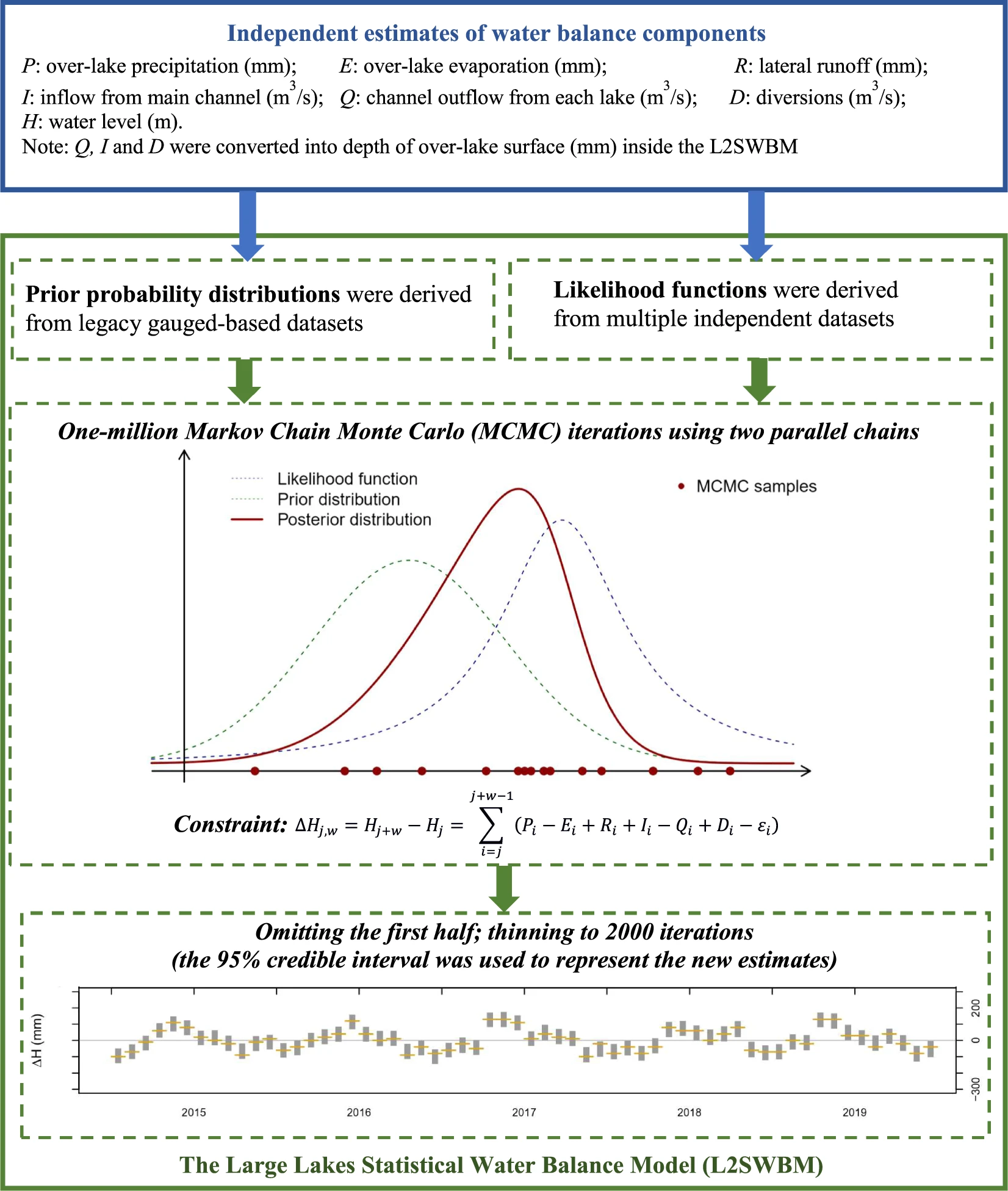 L2SWBM contextualizes and reduces uncertainty while closing the water balance over consecutive historical periods. The model assimilates multiple datasets for each hydrologic component (i.e., over-lake precipitation, over-lake evaporation, runoff, connecting channel flows, and interbasin diversions) and runs millions of iterations to reconstruct potential historical water budgets. Using observed and modeled data of water balance components through the historical record, the L2SWBM can be used to iteratively solve the coefficient values and adequately quantify uncertainty and reconcile the discrepancies between model- and measurement-based estimates of each water balance component from various datasets that are faithful to the water balance.