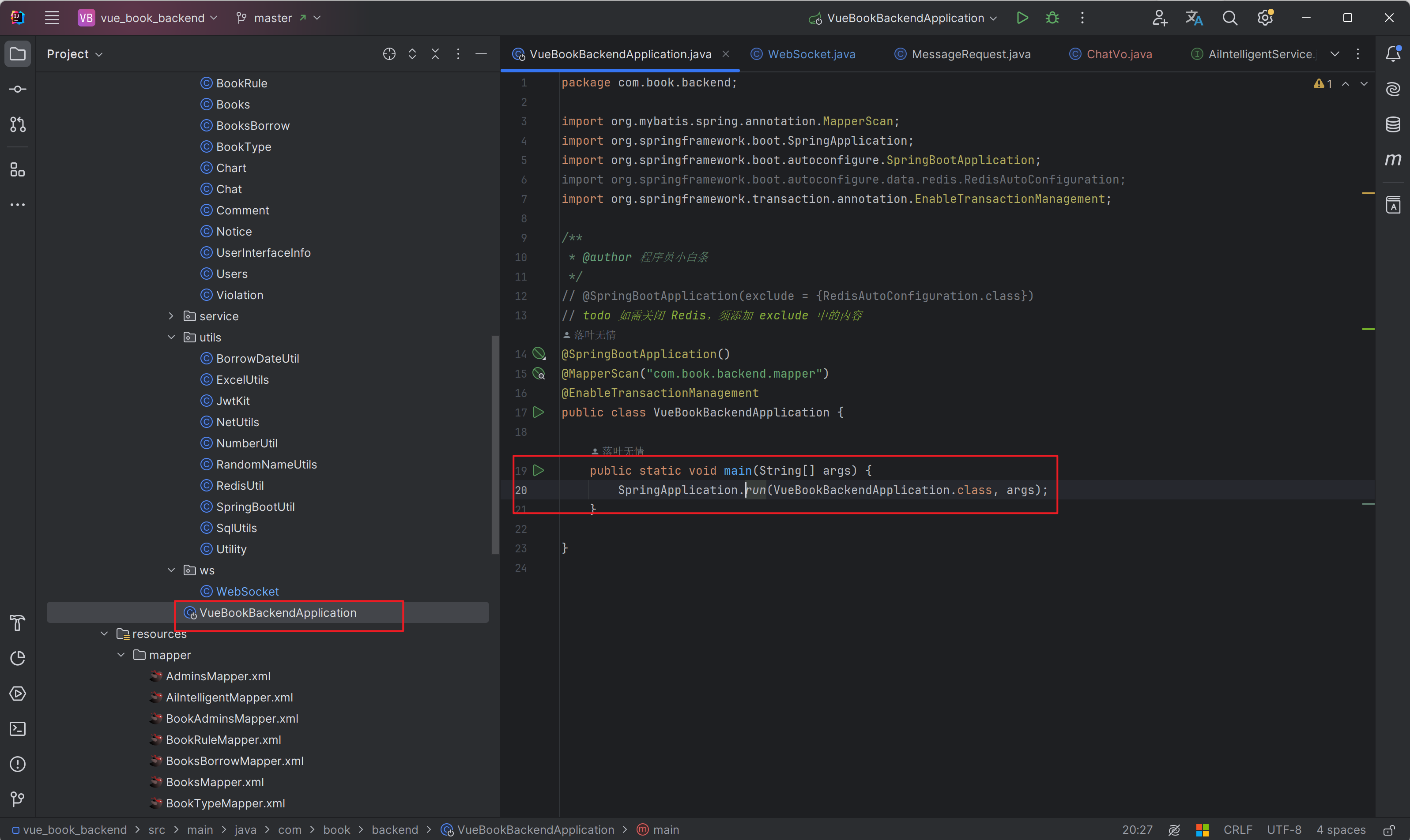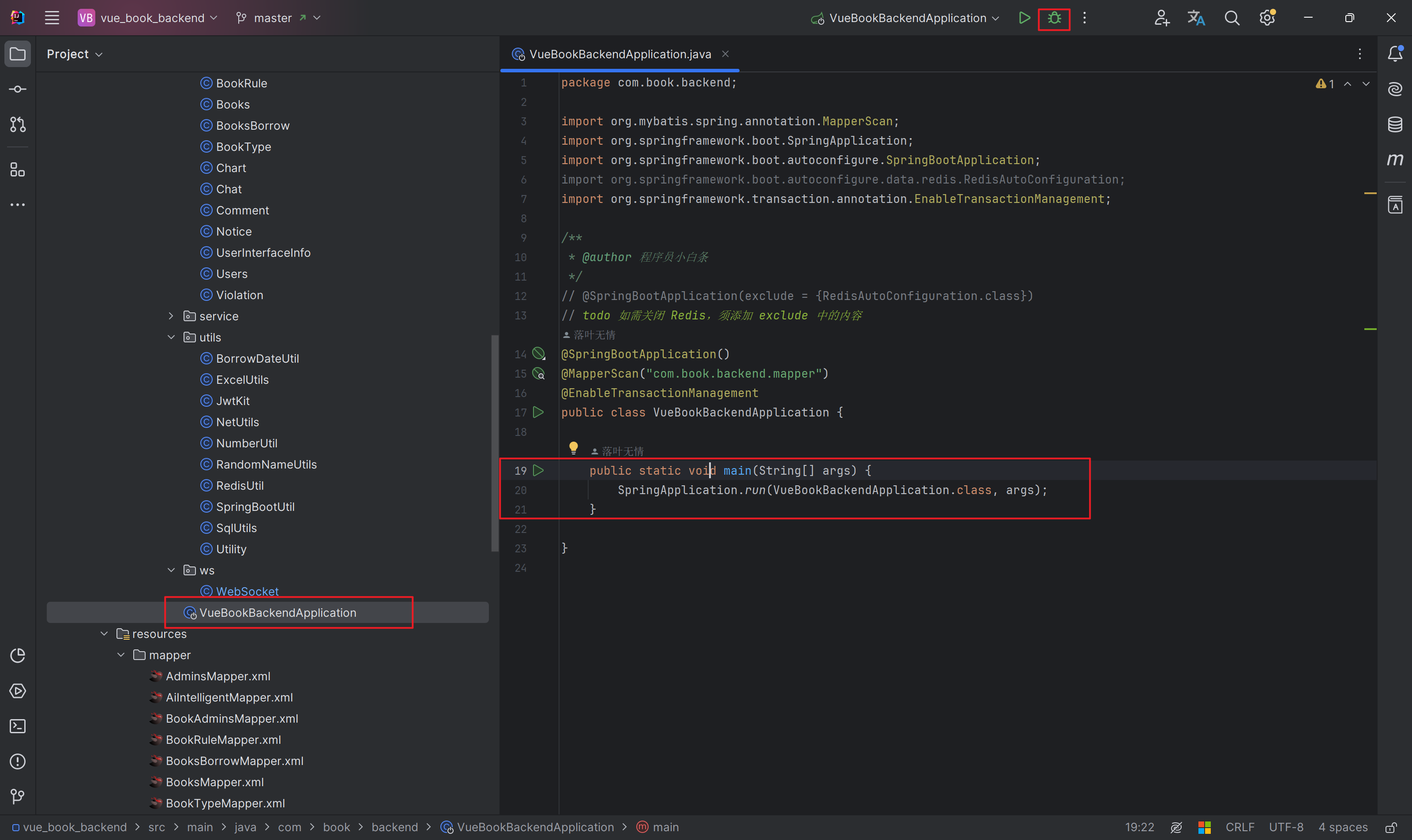5)找到 SpringBoot 启动类,我建议用 Debug 模式启动项目,更好排查错误。
