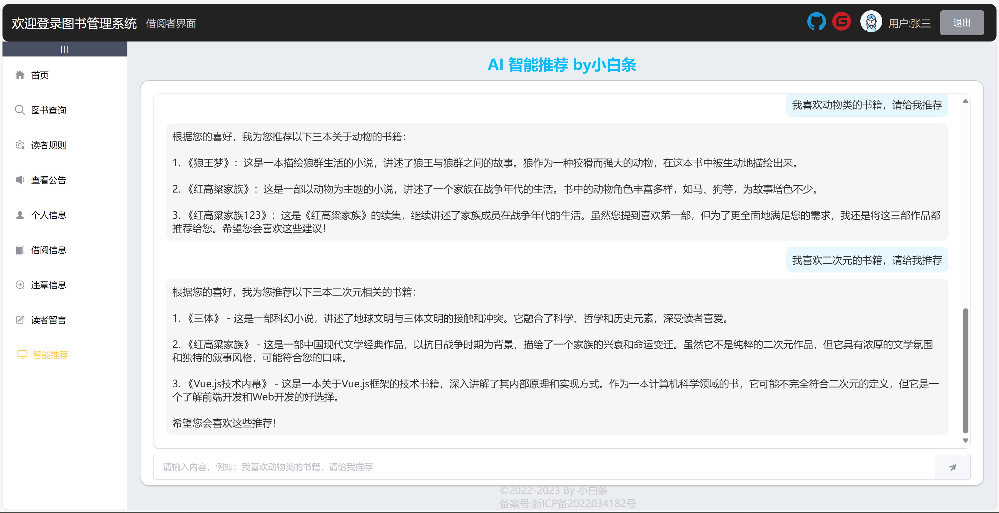 1.增加智能推荐页面,能够与AI进行交流,用户输入自己喜欢xxx类的书籍,AI能够在现有数据库中进行分析,然后给用户作出推荐,调用的是国内AI模型,底层是OpenAI。