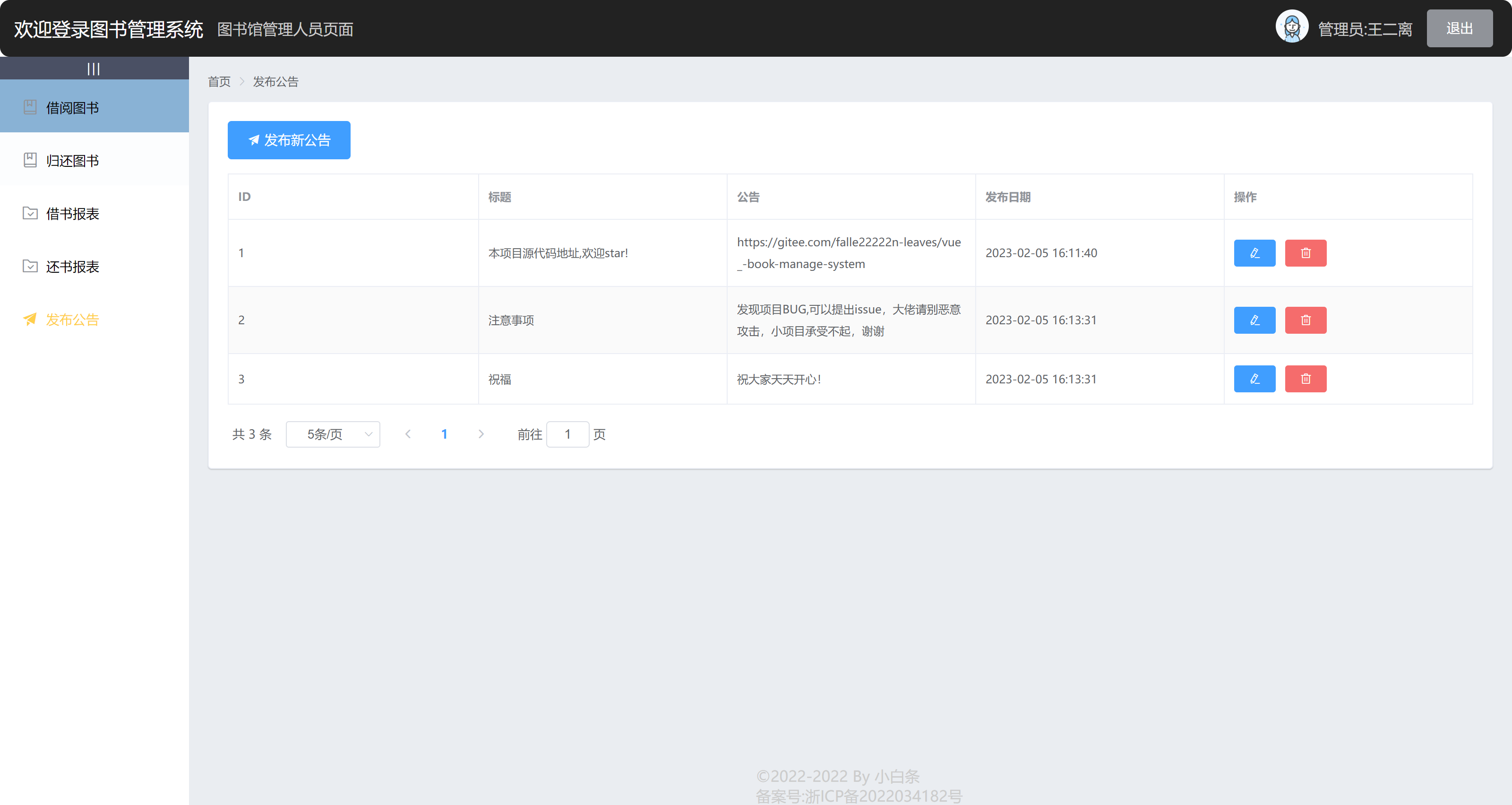 5)发布公告: 可以查询当前发布的公告列表,并进行删除,修改,增加功能,分页构造器用于缓解数据量大的情况。