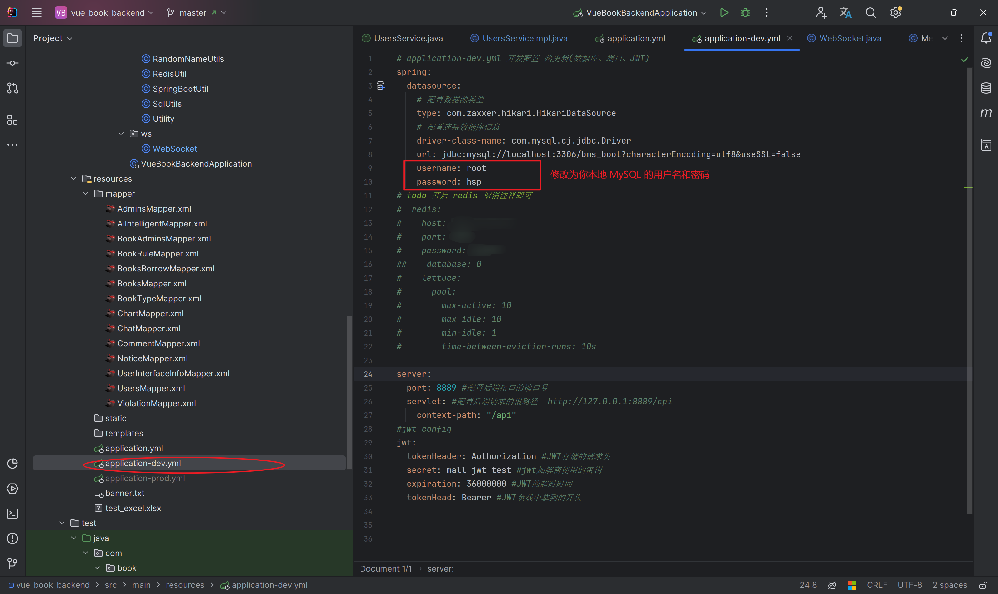 3)用 IDEA 打开后端项目,找到 application-dev.yml 文件,修改其中的 MySQL 配置,保证用户名和密码正确,注:密码不能以数字 0 开头。
