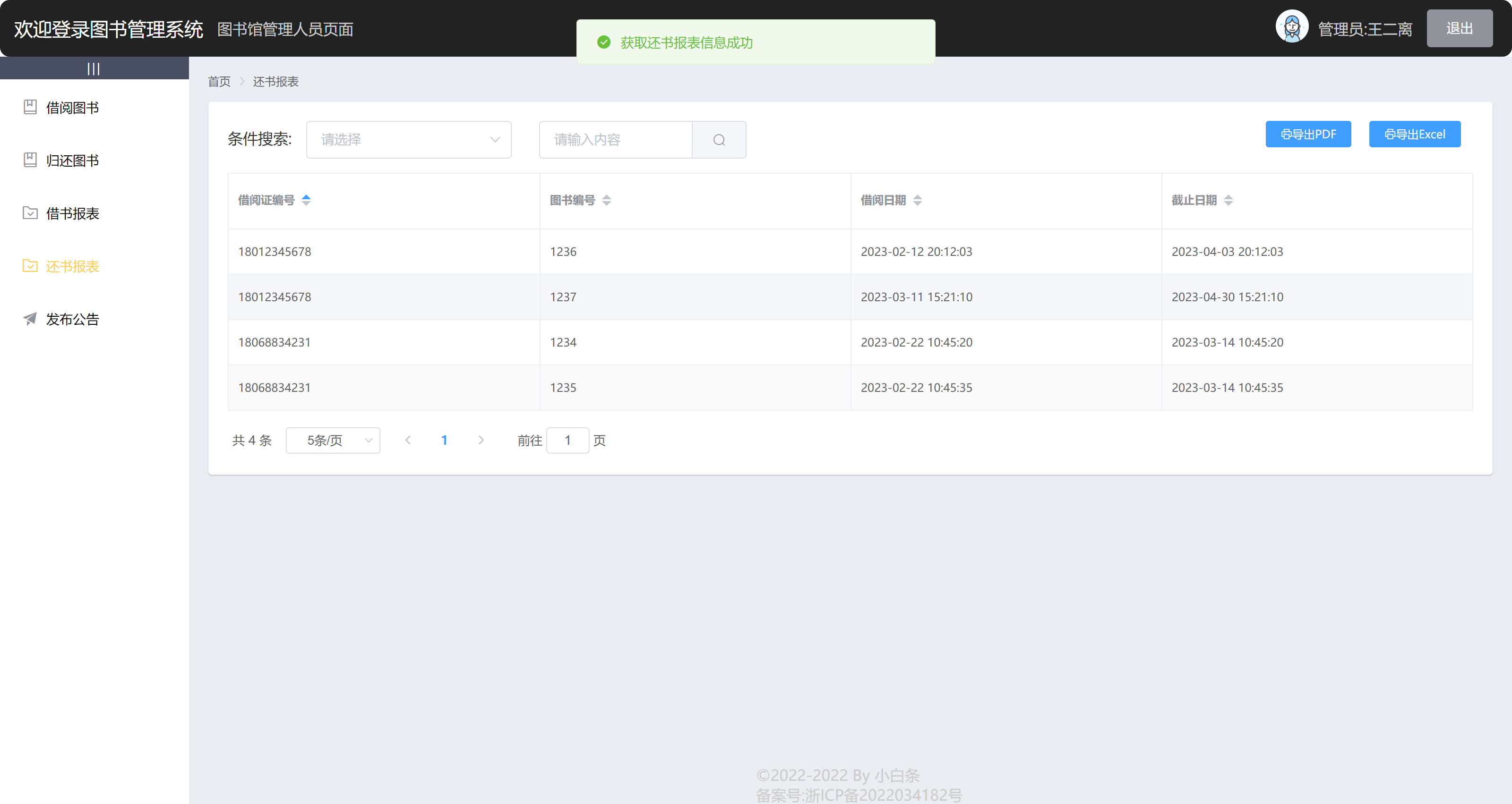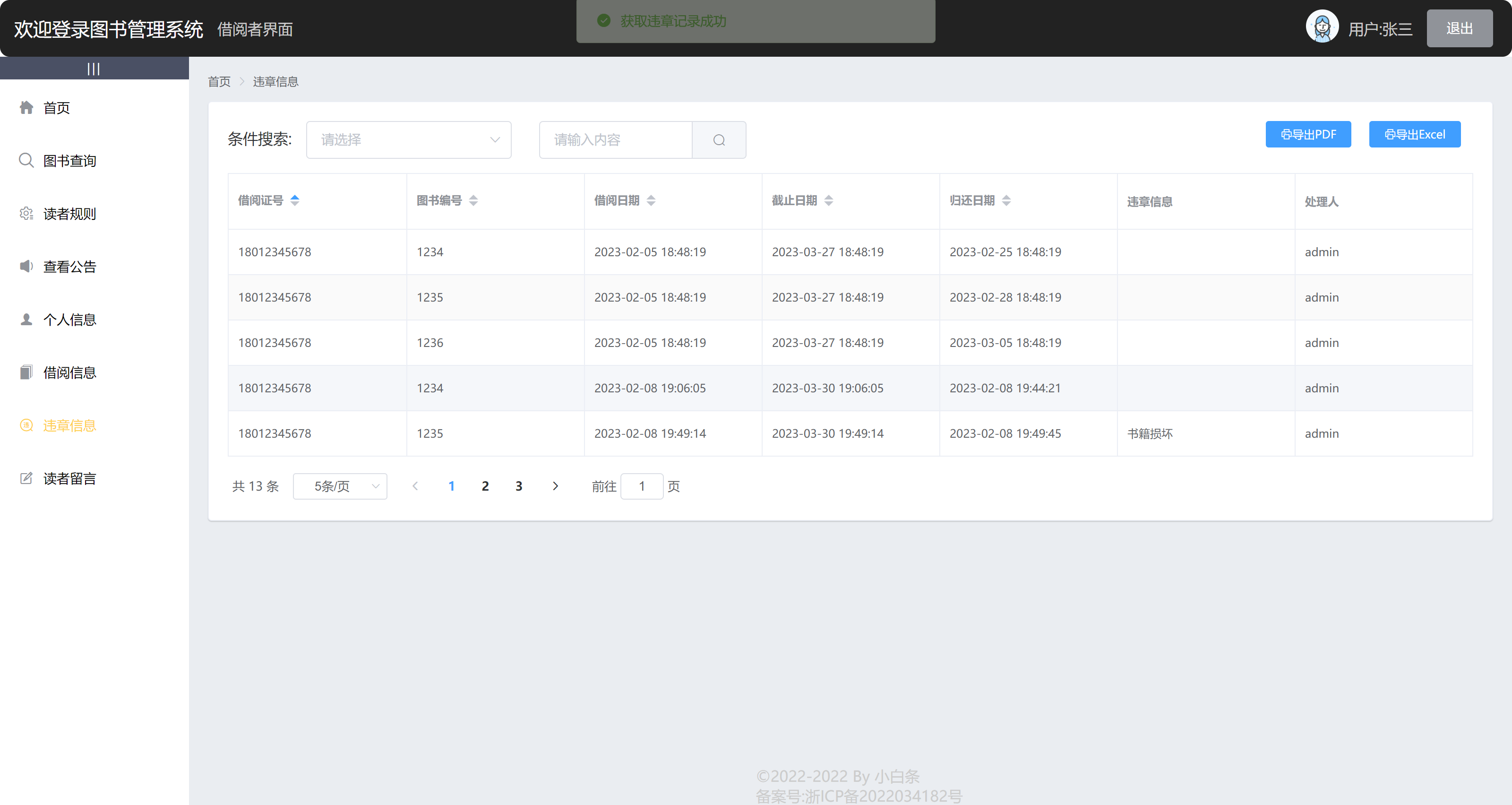 4)借阅信息查询: 可以查询当前已经完成借阅和归还的记录,显示借阅证号,书籍编号,借阅日期,截止日期,归还日期,违章信息,处理人。分页功能,PDF 和 EXCEL 导出。