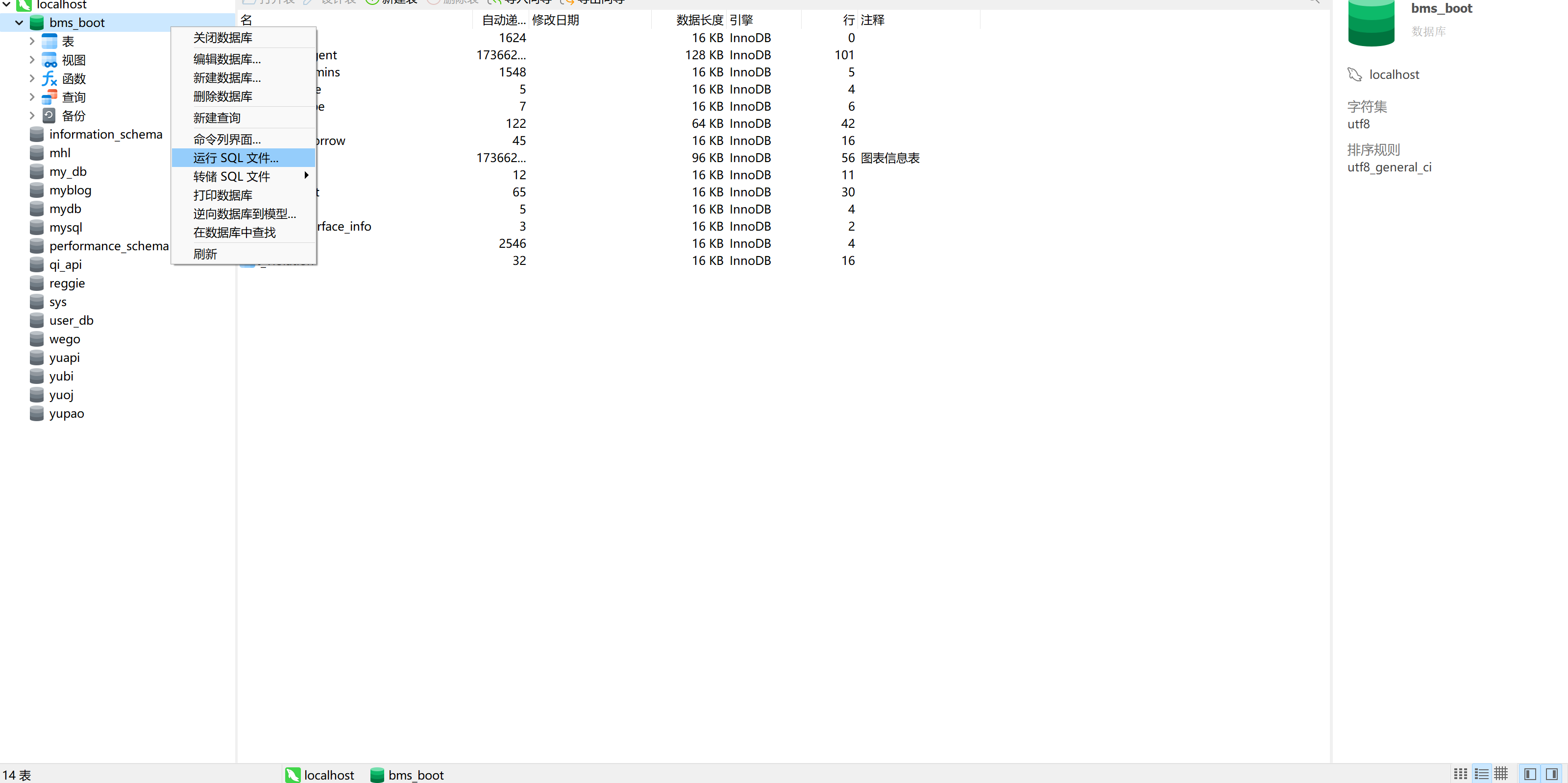 2)领取数据库模拟文件后,利用 Navicat 或者 SQLYog 等软件导入数据库文件,记得先建立一个名为 bms_boot 的数据库,然后右键点击运行 SQL 文件即可,运行成功,无报错后,重新打开数据库,检查是否有数据,如果有数据,表明导入成功。