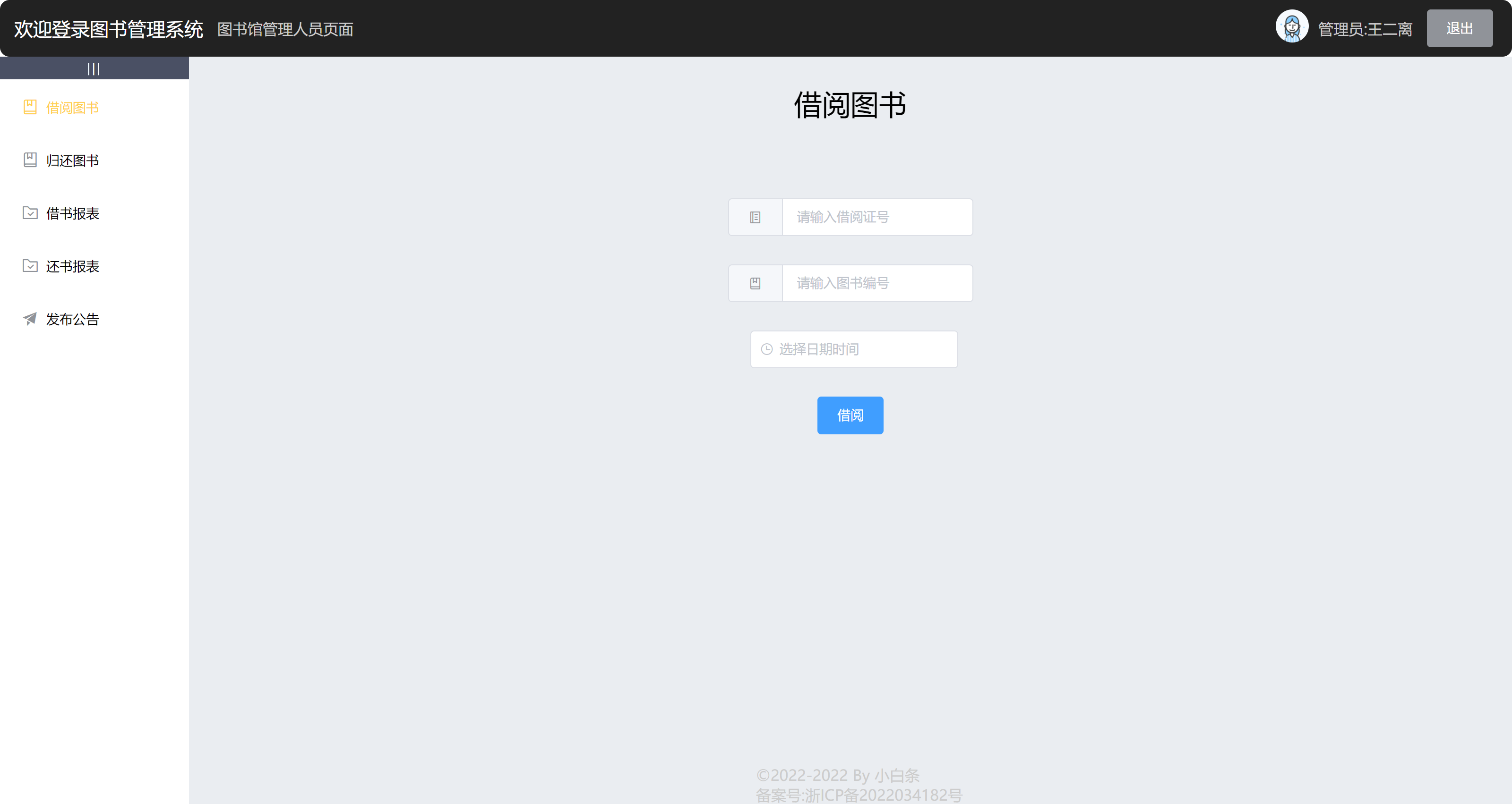1)借阅图书: 图书管理员输入借阅证号(用户)和要借的图书编号和当前的时间,点击借阅。