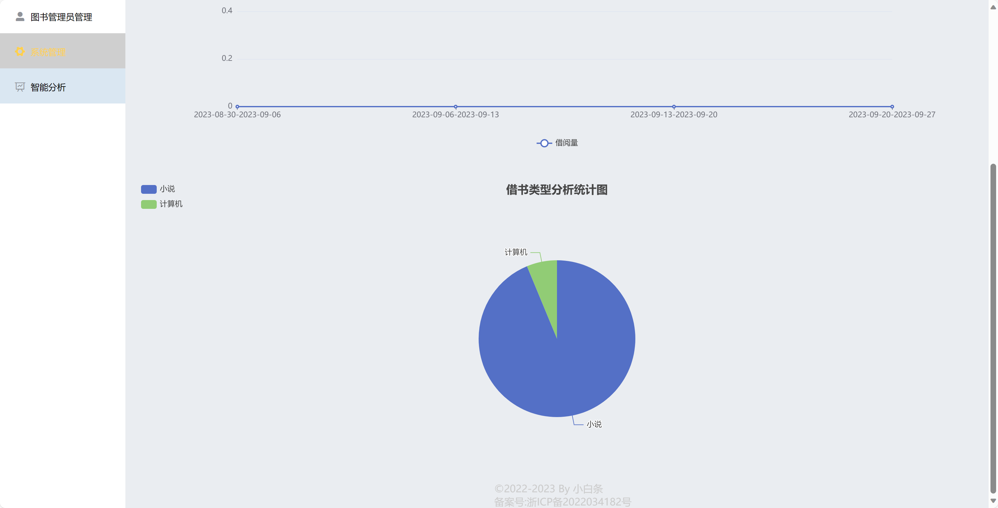 1.添加“系统管理员”权限的系统管理功能,**添加借书类型分析统计图(饼图)**采用Echarts。