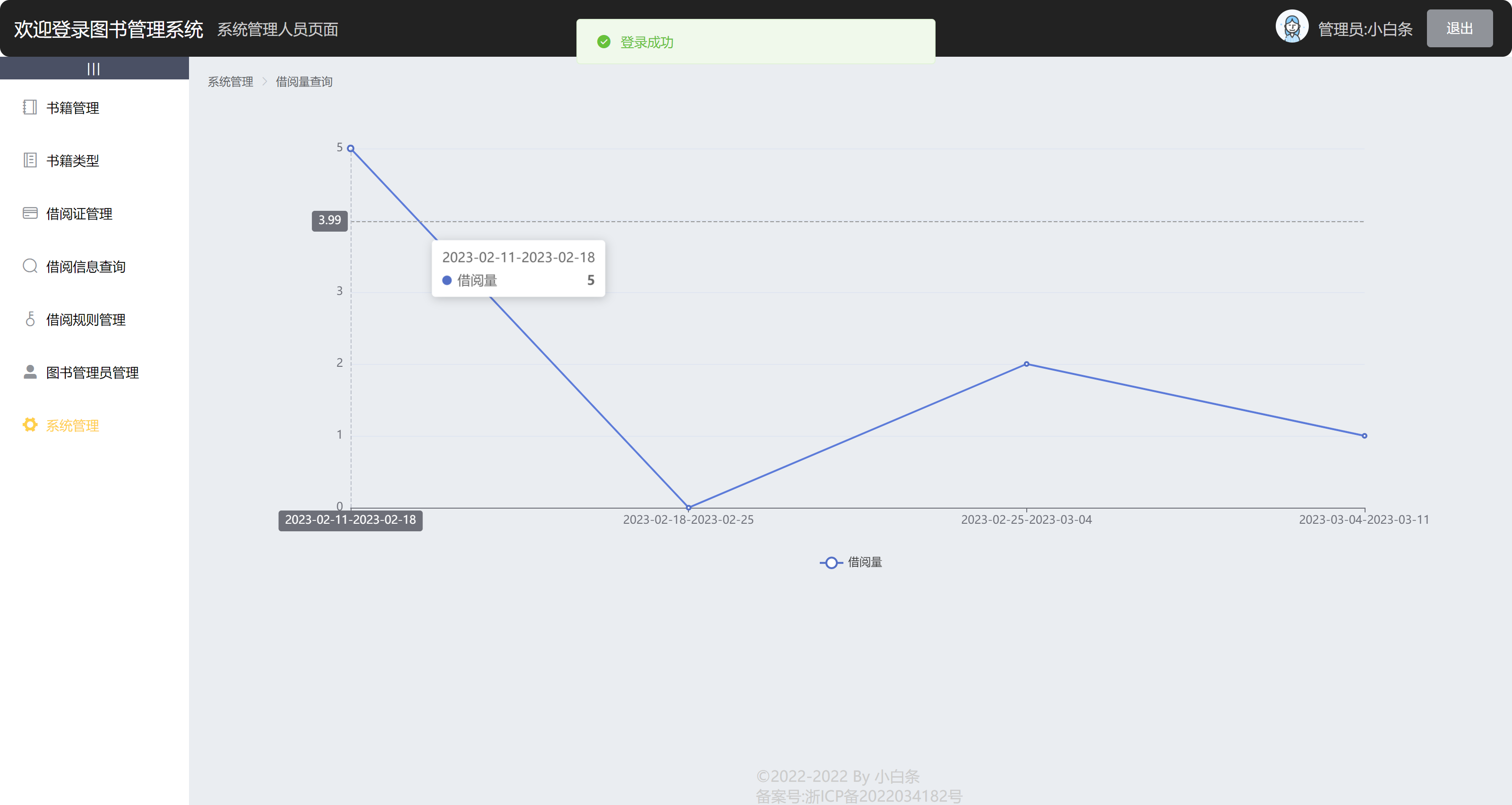 7)系统管理: 可以查询一个月内的借阅量,以一周为时间间隔,计算借阅量,用 Echarts 实现各种图表的展示。