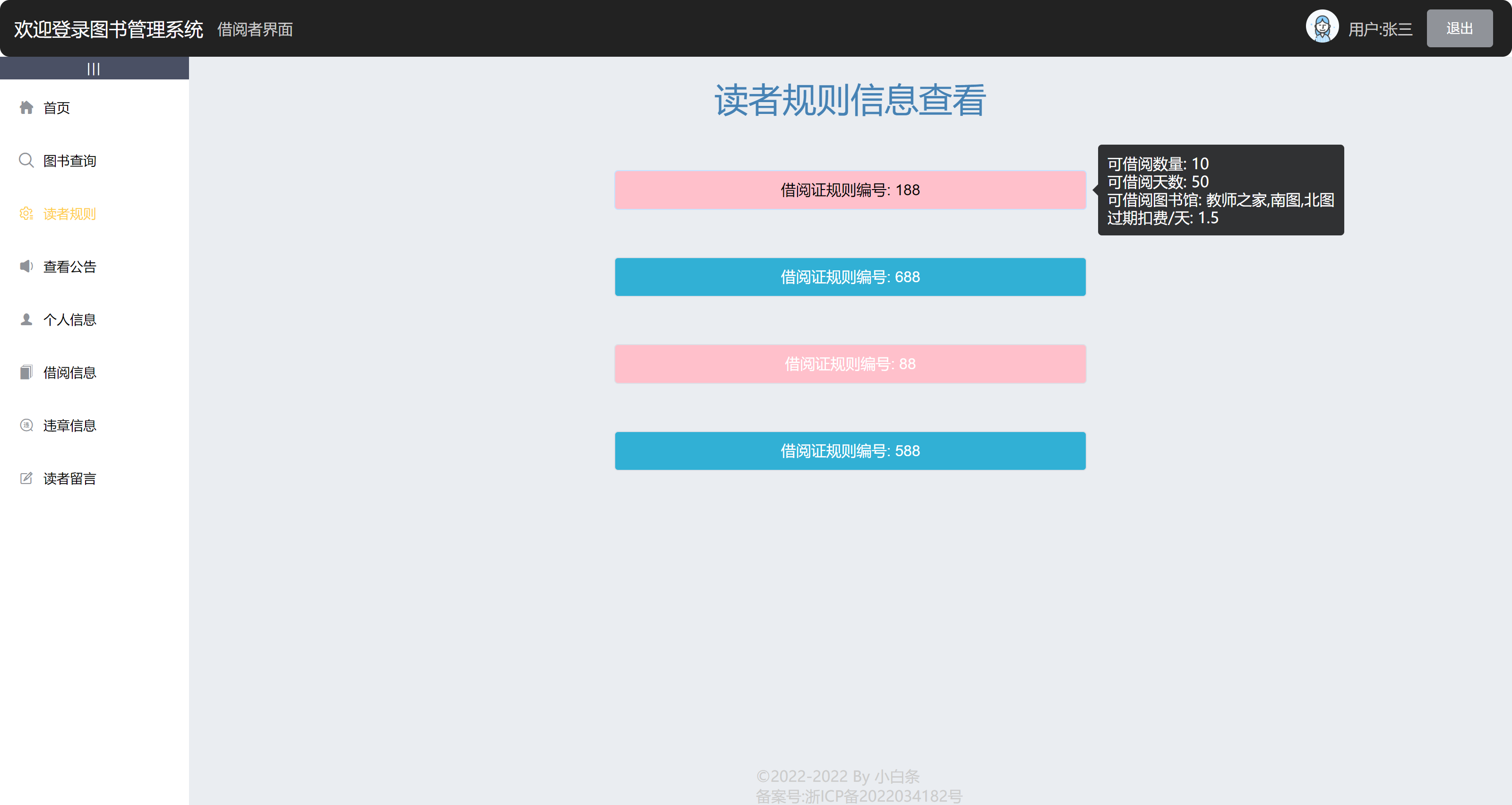 2)读者规则功能:查询现有的借阅规则,借阅规则包括:借阅编号,可借阅图书数量,可借阅天数,可借阅图书馆,过期扣费/天。