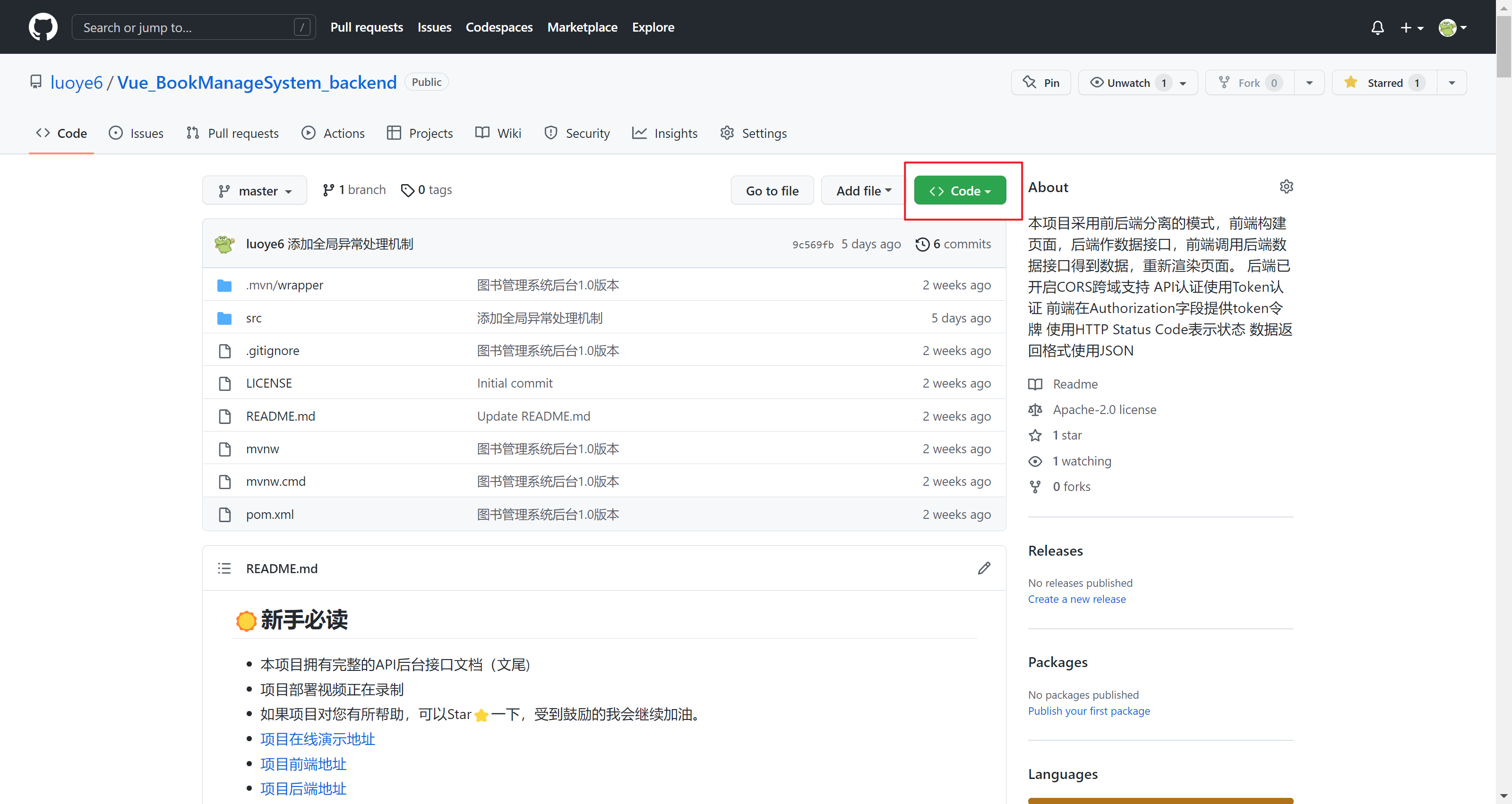 1)点击克隆/下载项目,会使用 Git 进行版本控制的,推荐 Git Clone,不会的小伙伴可以选择下载一个 Zip 压缩包,然后解压到自己电脑的 D 盘,推荐直接 Star,后续直接向我拿数据库模拟文件和 API 接口文档。