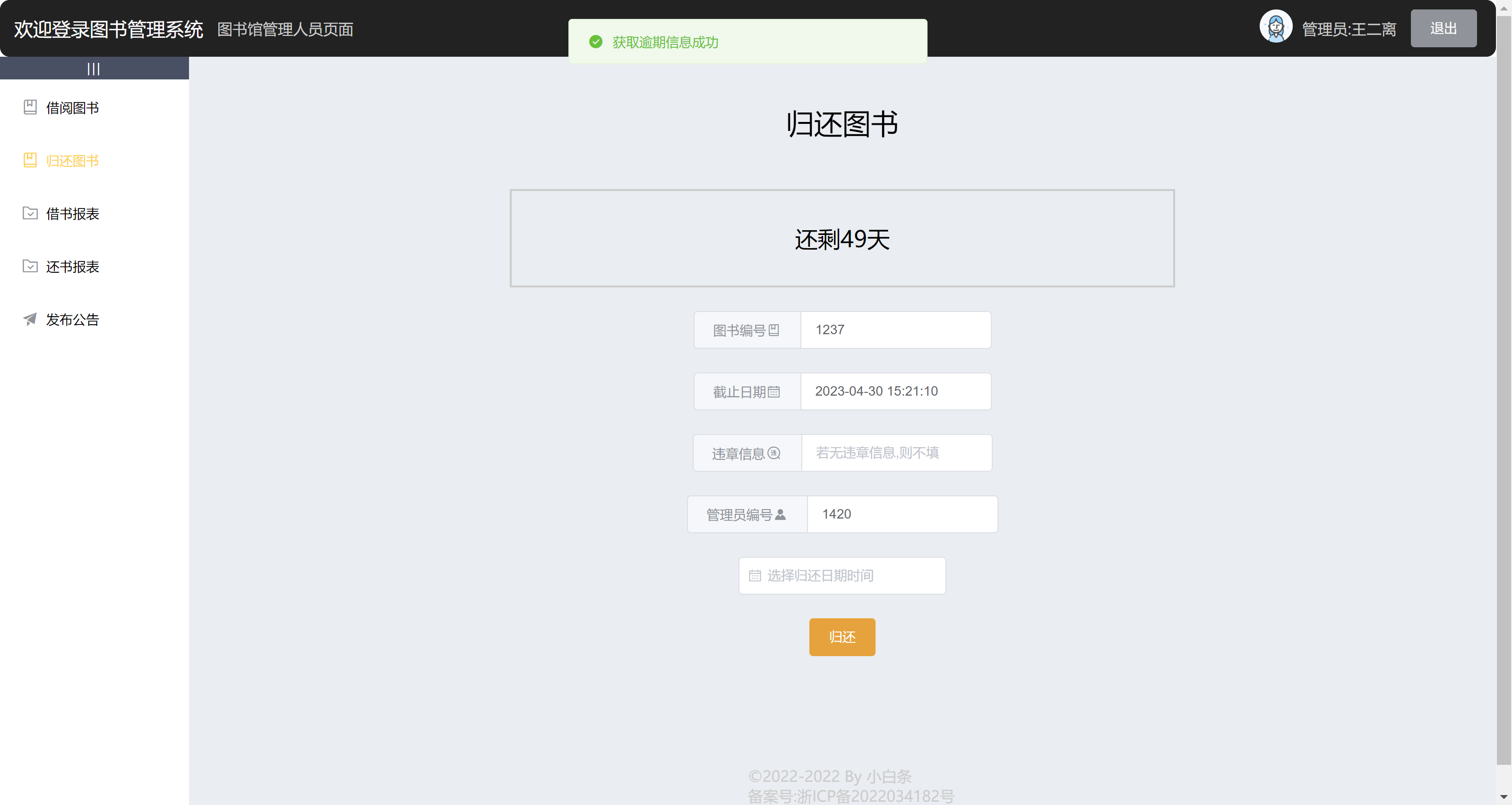 2)归还图书: 输入图书编号查看图书是否逾期,并且可以设置违规信息,然后选择是否归还图书。