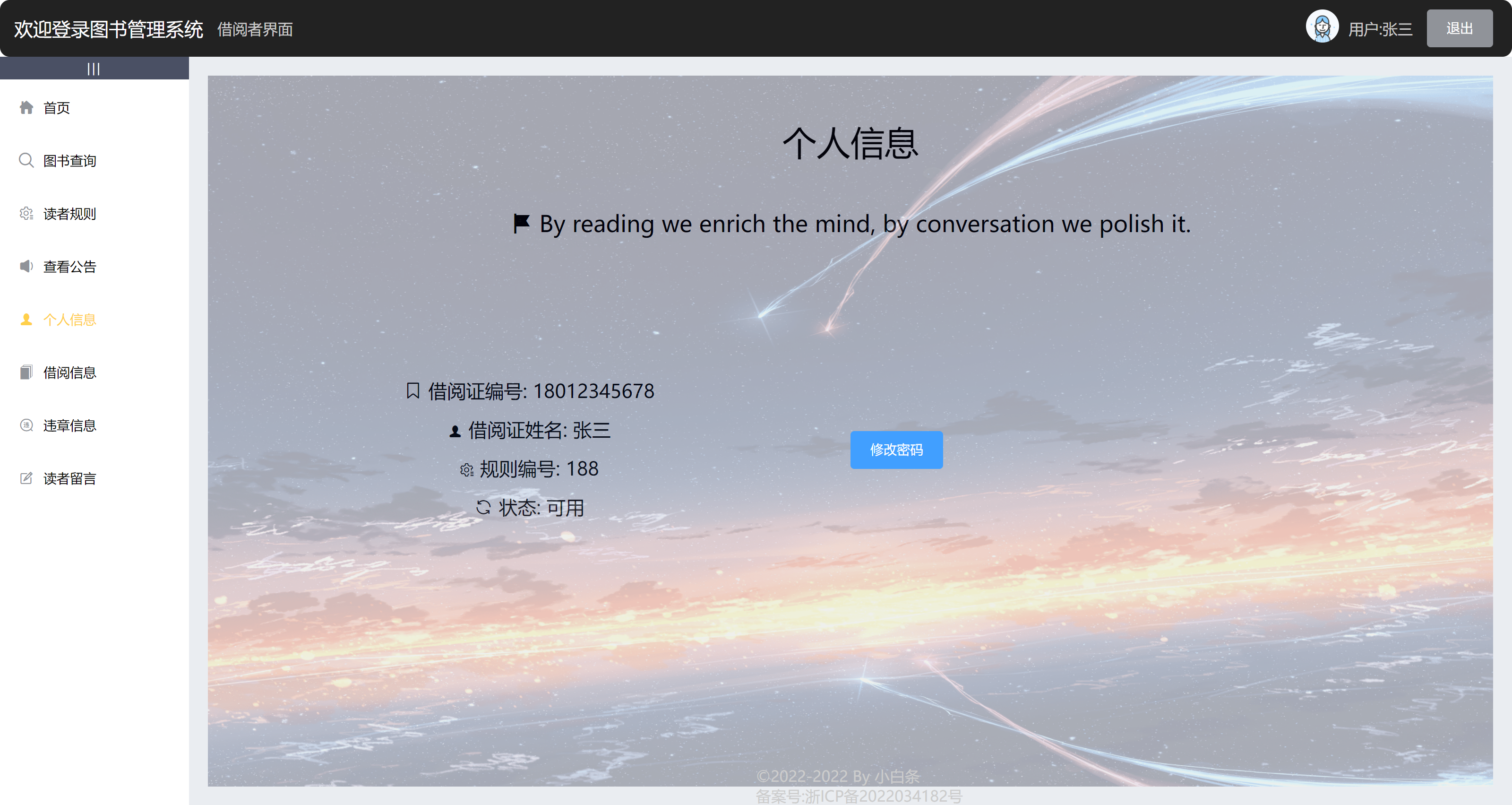 4)个人信息: 可以查看个人的借阅证编号,借阅证姓名,规则编号,状态,可以修改个人账户的密码。