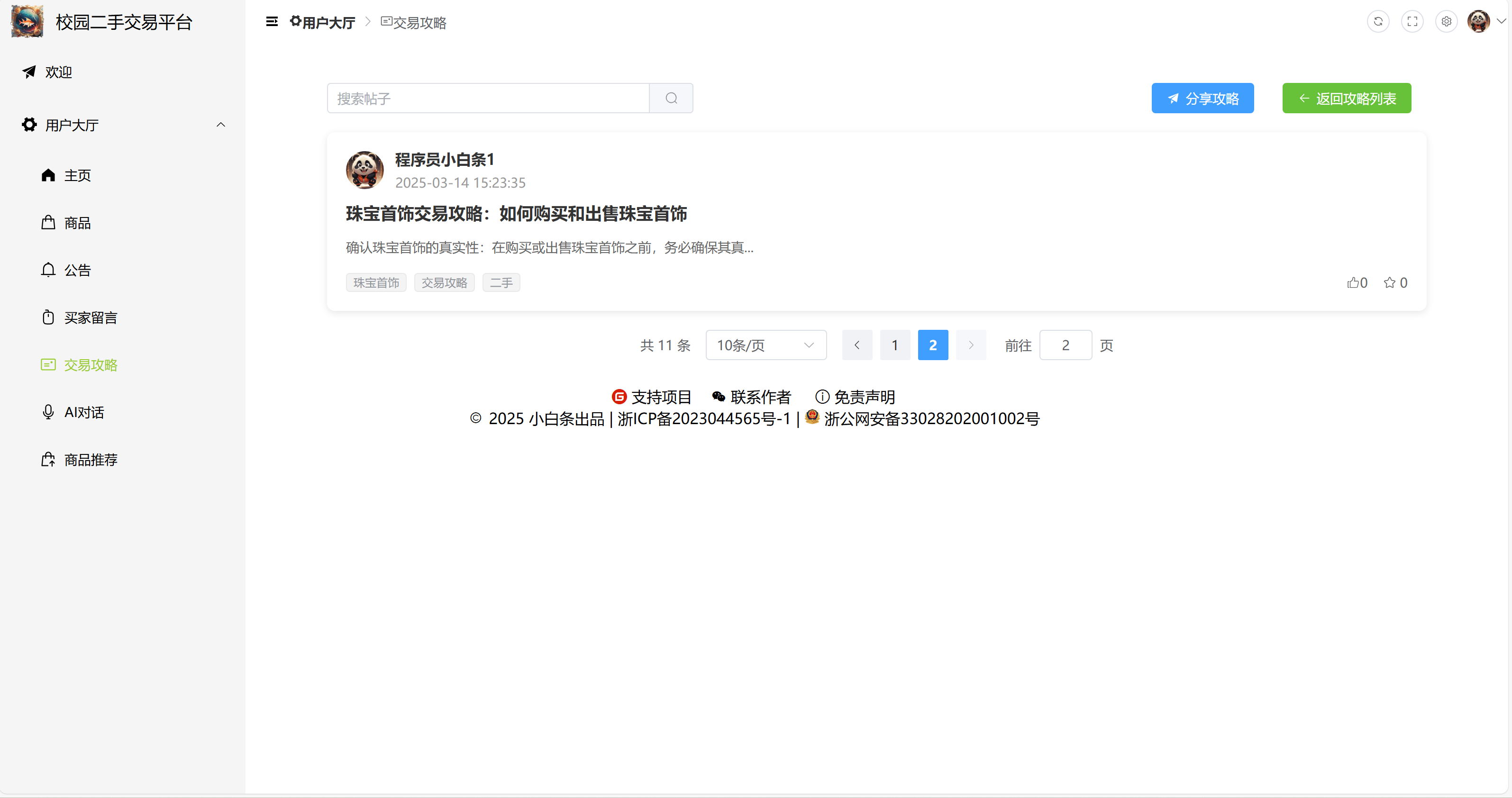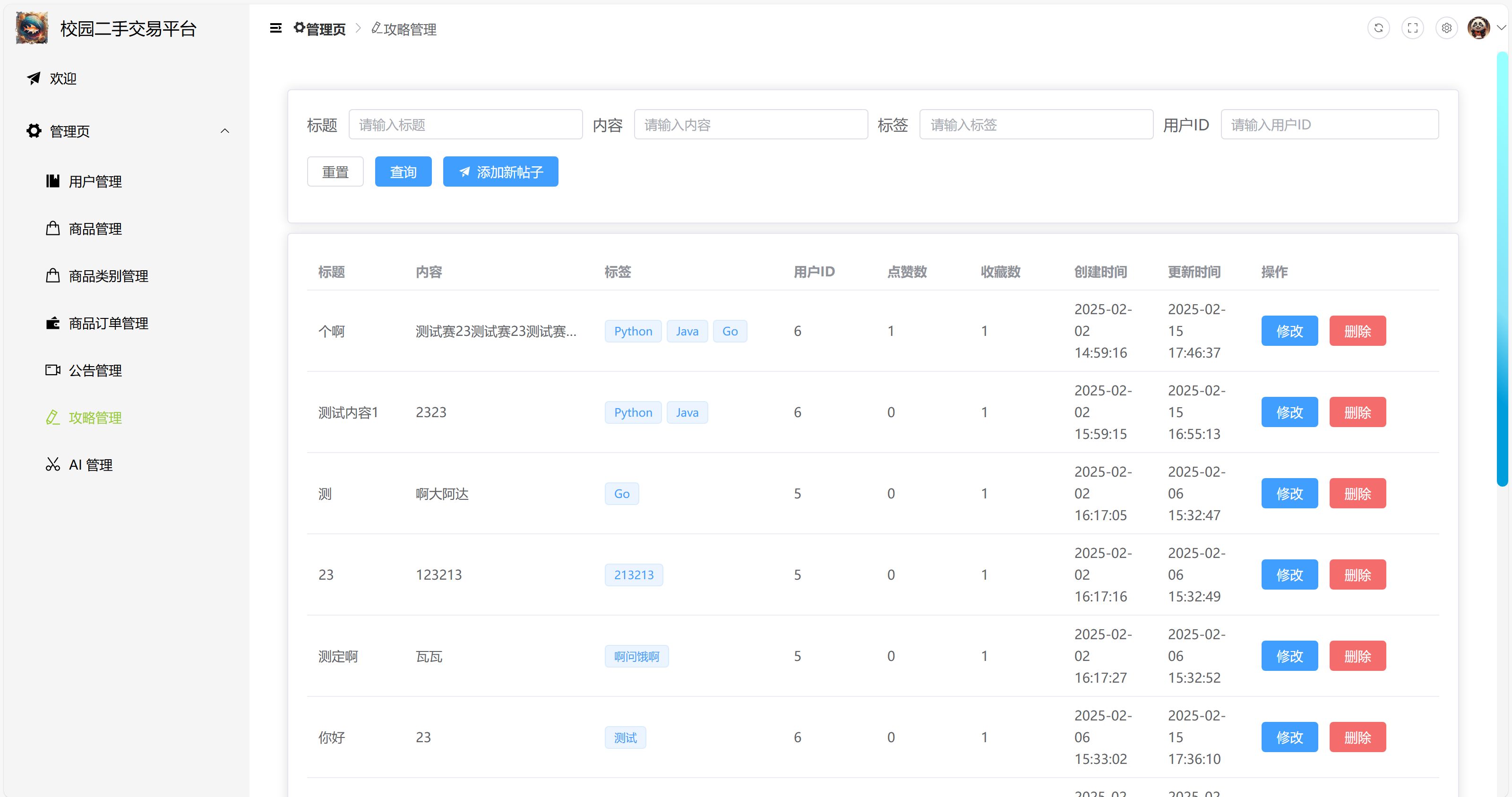 3)二手商品攻略管理:添加新攻略、修改攻略、删除攻略,支持分页和模糊查询(帖子标题、内容、标签、用户 ID)。
