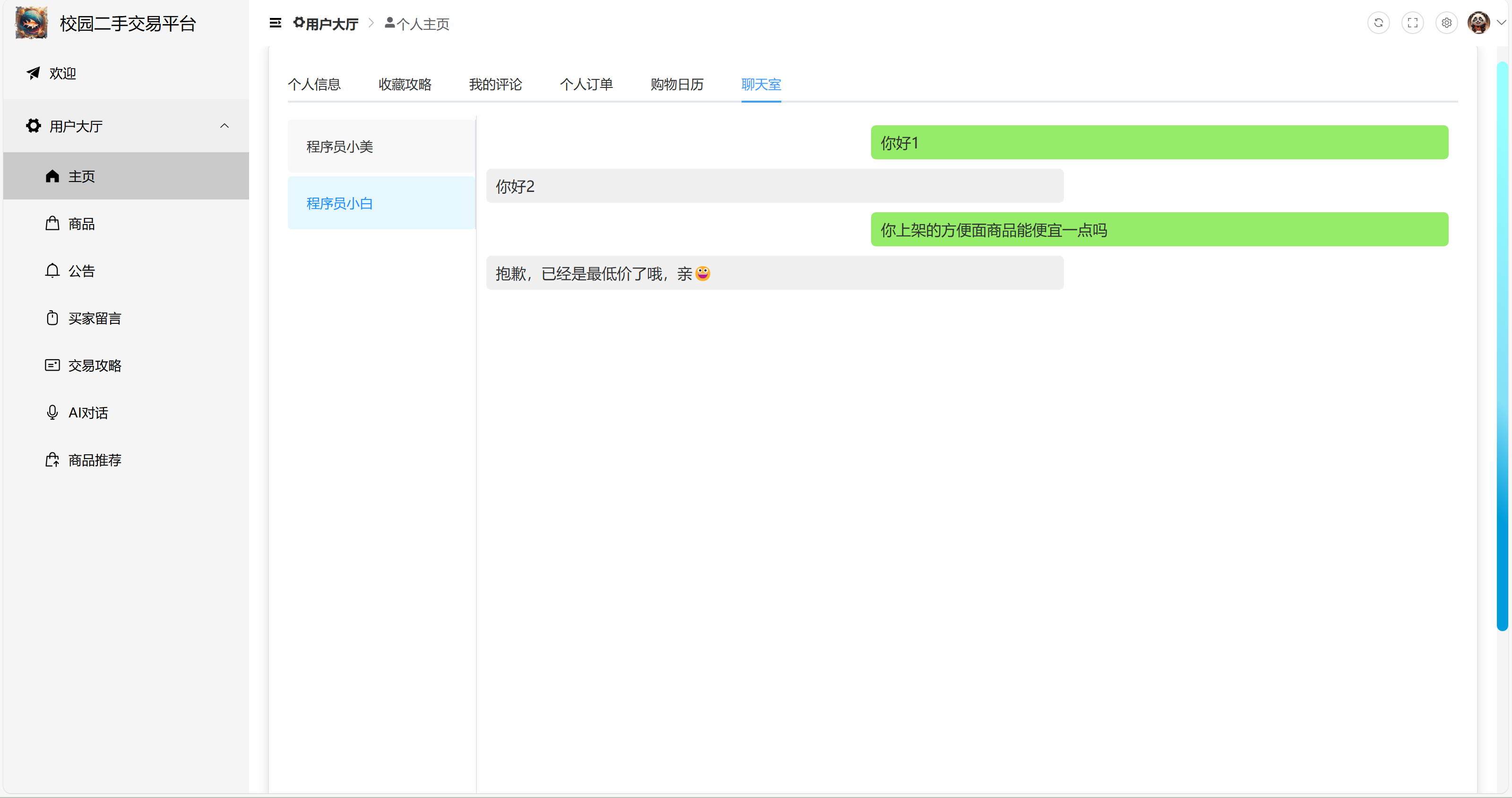 9)个人主页:展示个人购物记录日历(直接用 0 和 1 展示是否绿色购物),个人订单详情查看,个人评论查看,收藏的二手商品攻略查看,个人详情信息查看,聊天室功能(用户和管理员进行对话,支持 Emoji 表情包)。